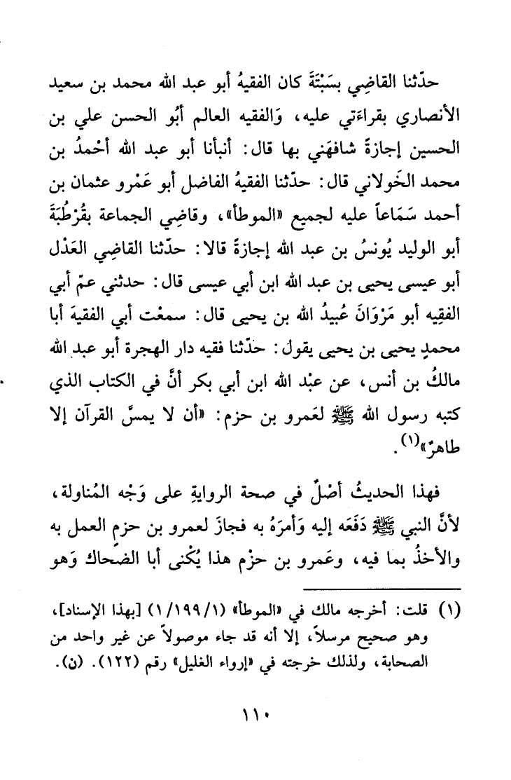 حدّثنا القاضِي بسَبْتَةَ كان الفقيهُ أبو عبد الله محمد بن سعيد الأنصاري بقراءَتي عليه، وَالفقيه العالم أبُو الحسن علي بن الحسين إجازةً شافهَني بها قال: أنباْنا أبو عبد الله أحْمدُ بن محمد الخَولاني قال: حدّثنا الفقيهُ الفاضل أبو عَمْرو عثمان بن أحمد سَمَاعاً عليه لجميع "الموطأ"، وقاضِي الجماعة بقُرْطُبَةَ أبو الوليد يُونسُ بن عبد الله إجازةً قالا: حدّثنا القاضِي العَدْل اْبو عيسى يحى بن عبد الله بن أبي عيسى قال: حدثني عمّ أبي الفقِيه أبو مَرْوَانَ عُبيدُ الله بن يحيى قال: سمعْت أبي الفقيهَ أبا محمدٍ يحى بن يحيى يقول: حدّثنا فقيه دار الهجرة أبو عبد الله مالكُ بن أنس، عن عبْد الله بن أبي بكر أنَّ في الكتاب الذي كتبه رسول الله - صلى الله عليه وسلم - لعَمرو بن حزم: "أن لا يمسَّ القرآن إلا طاهرٌ" (1) .