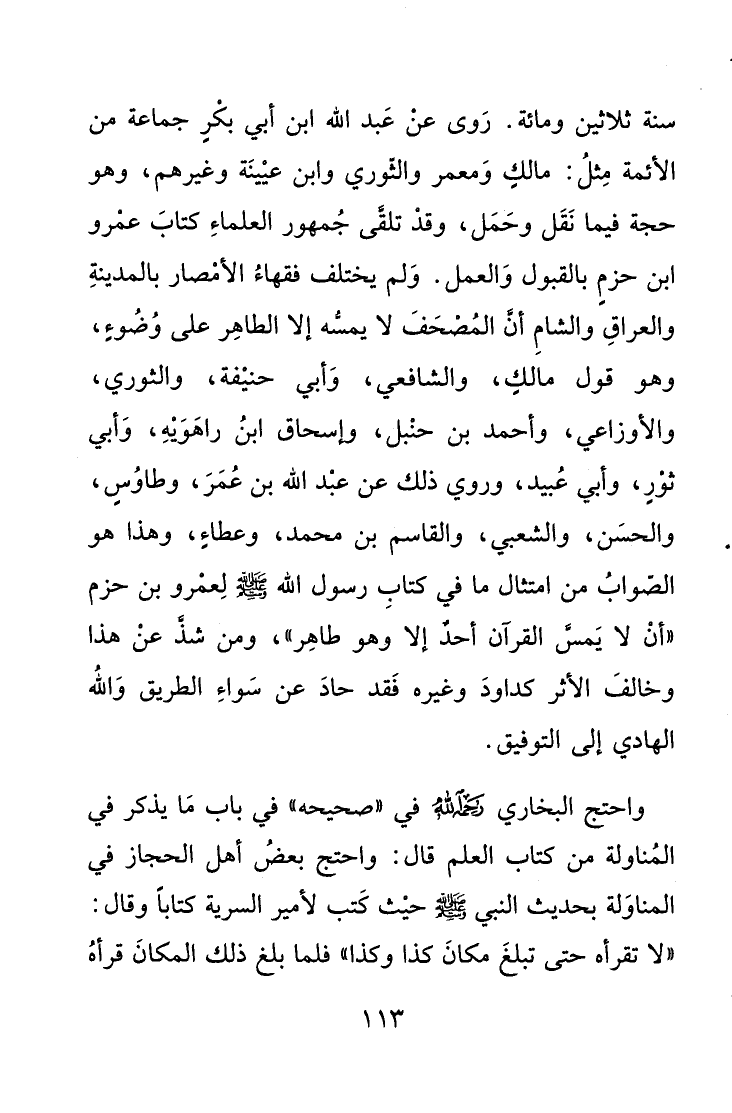سنة ثلاثين ومائة. رَوى عنْ عَبد الله بن أبي بكْرِ جماعة من الأئمة مِثلُ: مالكِ وَمعمر والثوري وابن عيْينَة وغيرهم، وهو حجة فيما نَقَل وحَمَل، وقدْ تلقَّى جُمهور العلماءِ كتابَ عمْرو ابن حزمِ بالقبول وَالعمل. وَلم يختلف فقهاءُ الأمْصار بالمدينةِ والعراقِ والشامِ أن المُصْحَفَ لا يمسَّه إلا الطاهِر على وُضُوءٍ، وهو قول مالكِ، والشافعي، وَأبي حنيْفة، والثوري، والأوزاعي، وأحمد بن حنْبل، وإسحاق ابنُ راهَوَيْهِ، وَأبي ثوْرِ، وأبي عُبيد، وروي ذلك عن عبْد الله بن عُمَرَ، وطاوُسِ، والحسَن، والشعبي، والقاسم بن محمد، وعطاءٍ، وهذا هو الصّوابُ من امتثال ما في كتابِ رسول الله - صلى الله عليه وسلم - لِعمْرو بن حزم "أنْ لا يَمسَّ القرآن أحدٌ إلا وهو طاهِر"، ومن شذَّ عنْ هذا وخالفَ الأثر كداودَ وغيره فَقد حادَ عن سَواءِ الطريق وَالله الهادي إلى التوفيق.