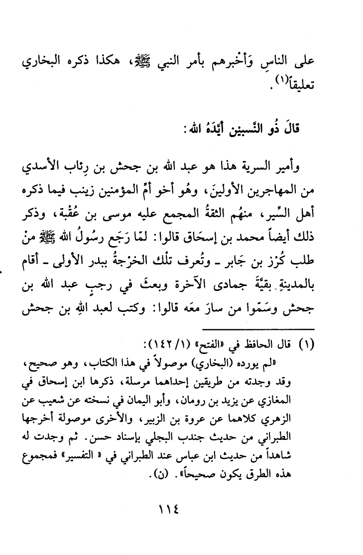وأمير السرية هذا هو عبد الله بن جحش بن رِئاب الأسدي من المهاجرين الأولينَ، وهُو أخو أمِّ المؤمنين زينب فيما ذكره أهل السًير، منهُم الثقةُ المجمع عليه موسى بن عُقْبة، وذكر ذلك أيضاً محمد بن إسحَاق قالوا: لمّا رَجَع رسُولُ الله - صلى الله عليه وسلم - منْ طلب كُرْز بن جَابر- وتُعرف تلْك الخرْجةُ ببدر الأولى- أقام بالمدينة بقيَّةَ جمادى الآخرة وبعثَ في رجبٍ عبد الله بن جحش وسَمّوا من سارَ معَه قالوا: وكتب لعبد الله بن جحش