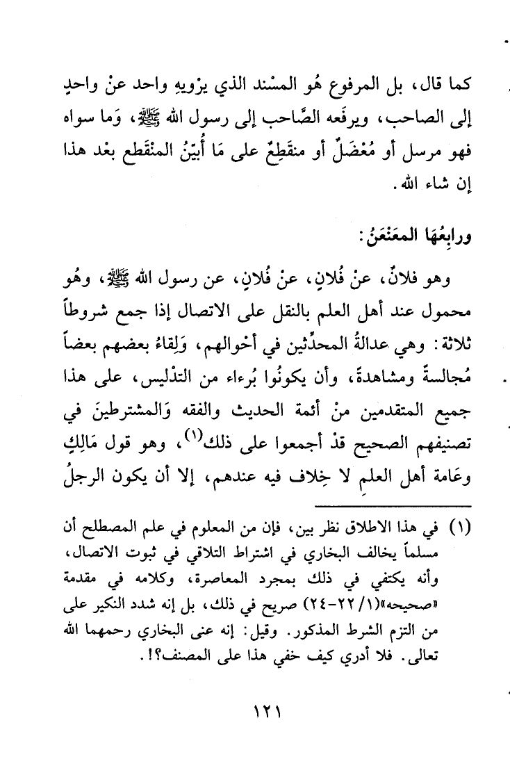 وهو فلانٌ، عنْ فُلانٍ، عنْ فُلانٍ، عن رسول الله صلى الله عليه وسلم، وهُو محمول عند أهل العلم بالنقل على الاتصال إذا جمع شروطاً ثلاثة: وهي عدالةُ المحدِّثين في أحْوالهم، وَلِقاءُ بعضهم بعضاً مُجالسةً ومشاهدةً، وأن يكونُوا بُرءاء من التدْليس، على هذا جميع المتقدمين منْ أئمة الحديث والفقه وَالمشترطينَ في تصنيفهم الصحيح قدْ أجمعوا على ذلك (1) ، وهو قول مَالِكِ وعَامة أهل العلمِ لا خِلاف فيه عندهم، إلا أن يكون الرجلُ