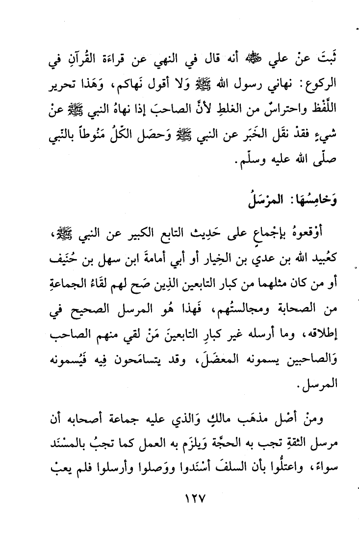 ثَبتَ عنْ علي - رضي الله عنه - أنه قال في النهي عن قراءَة القُرآنِ في الركوع: نهاني رسول الله صلى الله عليه وسلم وَلا أقول نَهاكم، وَهَذا تحرير اللّفْظ واحتراسٌ من الغلطِ لأن الصاحبَ إذا نهاهُ النبي صلى الله عليه وسلم عنْ شيءِ فقدْ نقَل الخَبَر عن النبي صلى الله عليه وسلم وَحصَل الكلُ مَنُوطاً بالنبي صلى الله عليه وسلم.