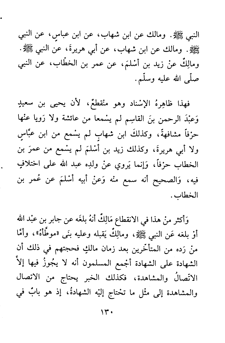 فهذا ظاهِرهُ الإسْناد وهو منْقطعٌ، لأن يحيى بن سعيد وَعبْدَ الرحمن بنَ القاسِم لم يسْمعا من عائشة ولا رَويا عنْها حرْفاً مشافهةً، وكذلكَ ابن شهاب لم يسْمع من ابن عبّاسٍ ولا أبي هريرةَ، وكذلك زيد بن أَسْلمَ لم يسْمع من عمرَ بن الخطاب حرْفاَ، وَإنما يَروي عنْ ولدِه عبد الله على اختلافٍ فيه، وَالصحيح أنه سمع منْه وَعنْ أبيه أسْلمَ عن عُمر بن الخطاب.