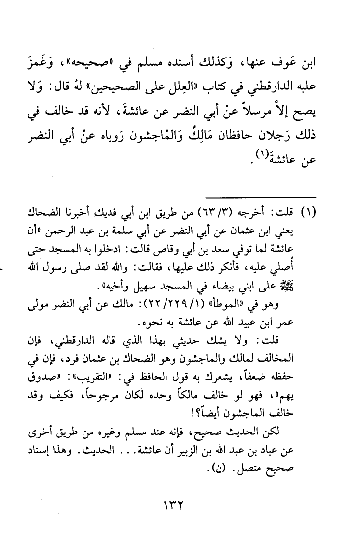 ابن عَوف عنها، وَكذلك أسنده مسلم في "صحيحه"، وَغَمزَ عليه الدارقطني في كتاب "العِلل على الصحيحين" لهُ قال: وَلا يصح إلّا مرسلاً عنْ أبي النضر عن عائشةَ، لأنه قد خالف في ذلك رَجلان حافظان مَالِكٌ وَالمْاجشون رَوياه عنْ أبي النضر عن عائشةَ (1) .