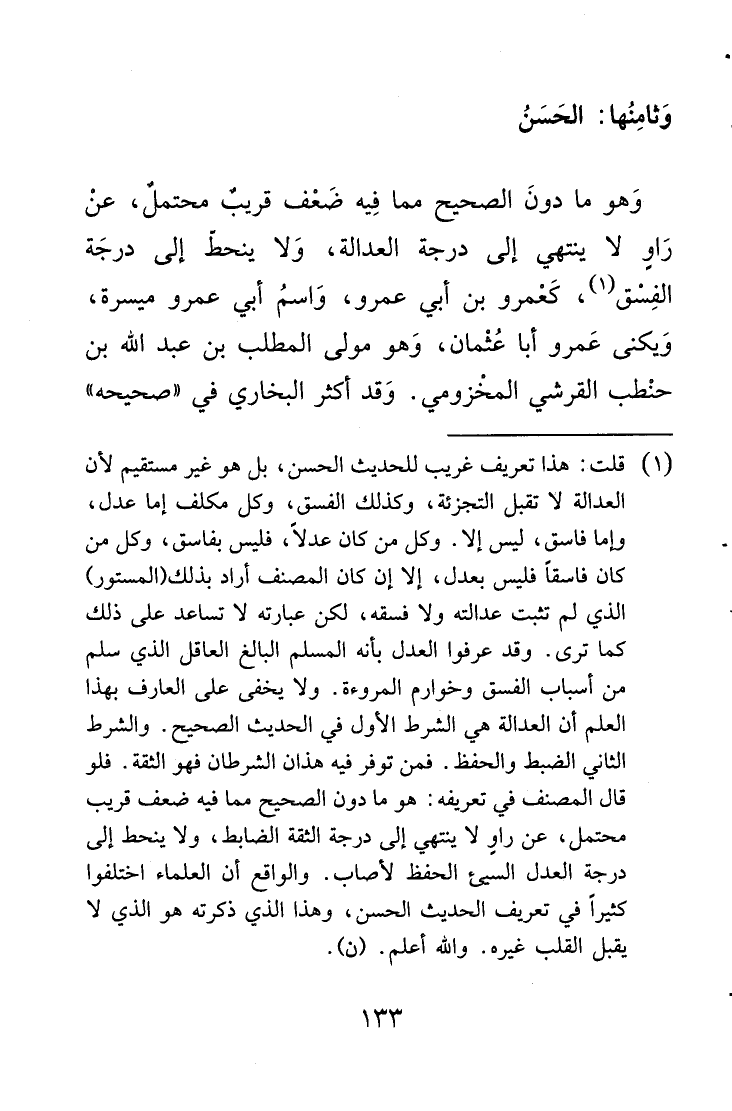 (1) قلت: هذا تعريف غريب للحديث الحسن، بل هو غير مستقيم لأن العدالة لا تقبل التجزئة، وكذلك الفسق، وكل مكلف إما عدل، وإما فاسق، ليس إلا. وكل من كان عدلاً، فليس بفاسق، وكل من كان فاسقاً فليس بعدل، إلا إن كان المصنف أراد بذلك (المستور) الذي لم تثبت عدالته ولا فسقه، لكن عبارته لا تساعد على ذلك كما ترى. وقد عرفوا العدل بأنه المسلم البالغ العاقل الذي سلم من أسباب الفسق وخوارم المروءة. ولا يخفى على العارف بهذا العلم أن العدالة هي الشرط الأول في الحديث الصحيح. والشرط الثاني الضبط والحفظ. فمن توفر فيه هذان الشرطان فهو الثقة. فلو قال المصنف في تعريفه: هو ما دون الصحيح مما فيه ضعف قريب محتمل، عن راو لا ينتهي إلى درجة الثقة الضابط، ولا ينحط إلى درجة العدل السيىء الحفظ لأصاب. والواقع أن العلماء اختلفوا كثيراً في تعريف الحديث الحسن، وهذا الذي ذكرته هو الذي لا يقبل القلب غيره. والله أعلم. (ن) .