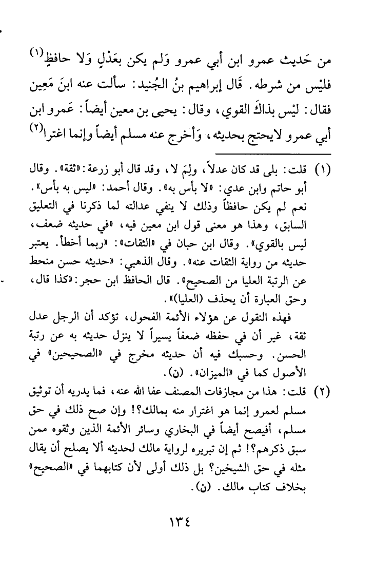 (2) قلت: هذا من مجازفات المصنف عفا الله عنه، فما يدريه أن توثيق مسلم لعمرو إنما هو اغترار منه بمالك؟! وإن صح ذلك في حق مسلم، أفيصح أيضاً في البخاري وسائر الأئمة الذين وثقوه ممن سبق ذكرهم؟! ثم إن تبريره لرواية مالك لحديثه ألا يصلح أن يقال مثله في حق الشيخين؟ بل ذلك أولى لأن كتابهما في "الصحيح" بخلاف كتاب مالك. (ن) .