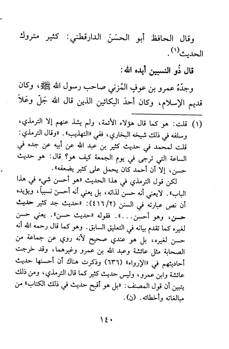 (1) قلت: هو كما قال هؤلاء الأئمة، ولم يشذ عنهم إلا الترمذي، وسلفه في ذلك شيخه البخاري، ففي "التهذيب". "وقال الترمذي: قلت لمحمد في حديث كثير بن عبد الله عن أبيه عن جده في الساعة التي ترجى في يوم الجمعة كيف هو؟ قال: هو حديث حسن، إلا أن أحمد كان يحمل على كثير يضعفه".