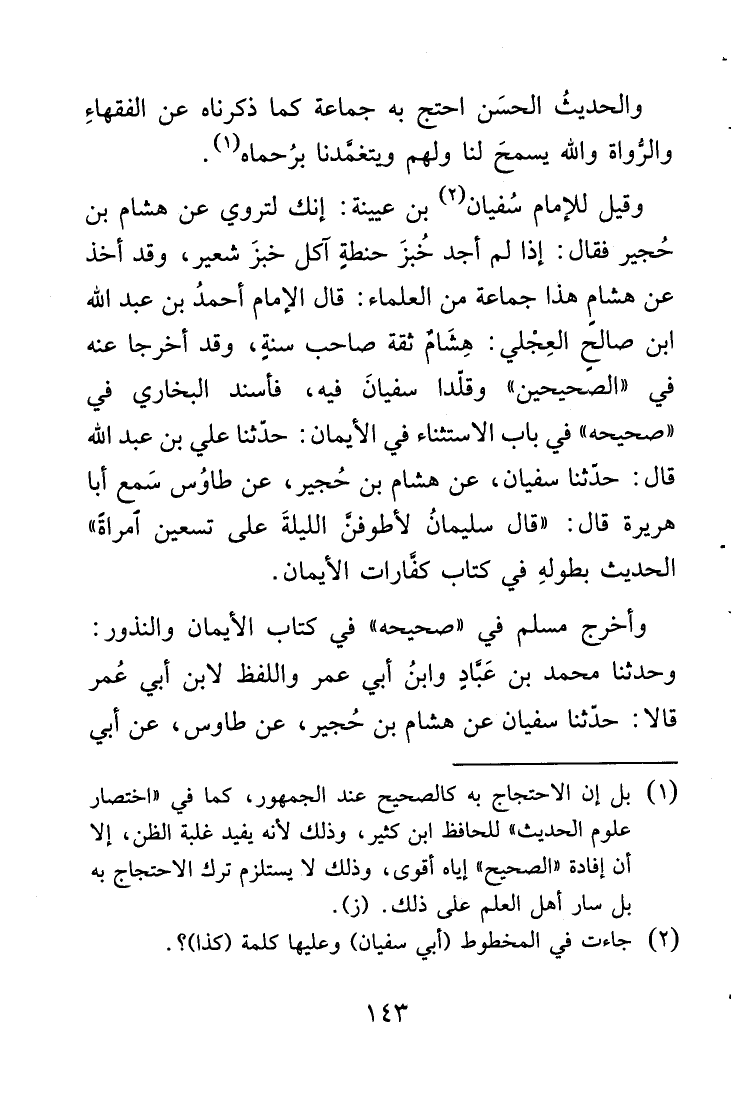 وقيل للإمام سُفيان (2) بن عيينة: إنك لتروي عن هشام بن حُجير فقال: إذا لم أجد خُبزَ حنطةِ آكل خبزَ شعير، وقد أخذ عن هشام هذا جماعة من العلماء: قال الإمام أحمدُ بن عبد الله ابن صالحَ العِجْلي: هِشَامٌْ ثقة صاحب سنةٍ، وقد أخرجا عنه في "الصَحيحين" وقلّدا سفيانَ فيه، فأسند البخاري في "صحيحه" في باب الاستثناء في الأيمان: حدّثنا علي بن عبد الله قال: حدّثنا سفيان، عن هشام بن حُجير، عن طاوُس سَمع أبا هريرة قال: "قال سليمانُ لأطوفنَّ الليلةَ على تسعين امراةً" الحديث بطولهِ في كتاب كفَّارات الأيمان.