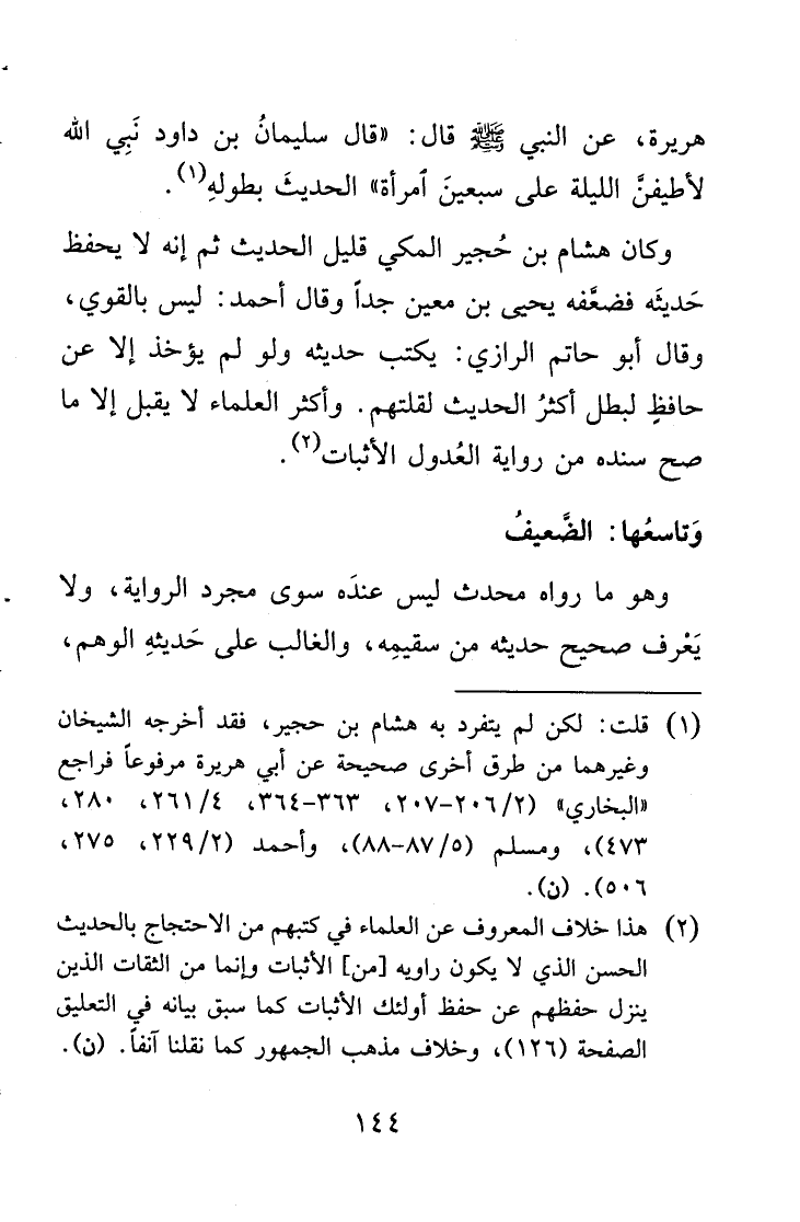 (1) قلت: لكن لم يتفرد به هشام بن حجير، فقد أخرجه الشيخان وغيرهما من طرق أخرى صحيحة عن أبي هريرة مرفوعاً فراجع "البخاري" (2/ 206-207، 363- 364، 4/261، 280، 473) ، ومسلم (5/ 87- 88) ، وأحمد (2/ 229، 275، 506) . (ن) .