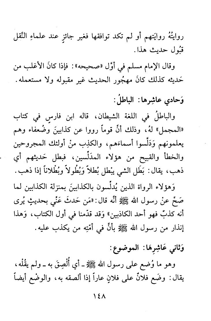 وقال الإمام مسلم في أوَّل "صحيحه": فإذا كانَ الأغلب من حَديثه كذلك كانَ مهجُور الحديث غير مقبوله ولا مستعمله. وَحادي عاشِرها: الباطلُ:
