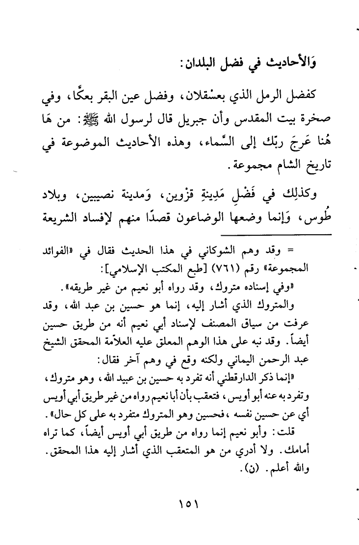 وكذلِك في فَضْلِ مَدِينةِ قزْوين، وَمدينة نصيبين، وبلاد طُوس، وَإنما وضعها الوضاعون قصداً منهم لإفساد الشريعة