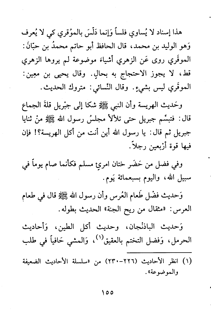 وحَديث الهريسة وأن النبي - صلى الله عليه وسلم - شكا إلى جبْريل قلةَ الجماع قال: فتبسَّم جبريل حتى تلألأ مجلسُ رسول الله - صلى الله عليه وسلم - منْ ثنايا جبريل ثم قال: يا رسول الله أين أنت من أكل الهريسة؟! فإن فيها قوة أرْبعين رجلاً.