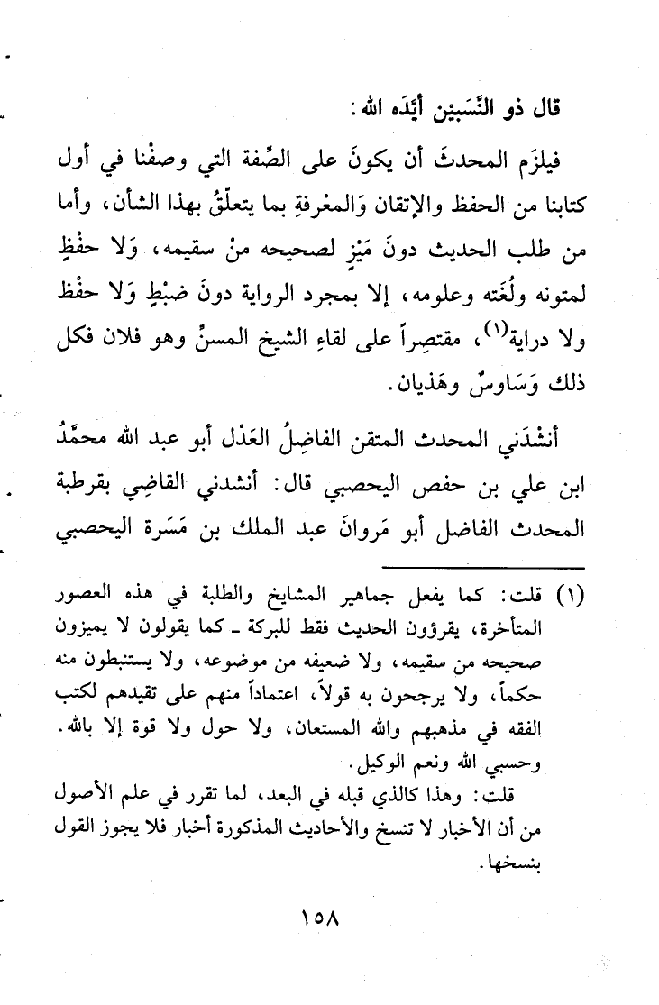 فيلزَم المحدثَ أن يكونَ على الصِّفة التي وصفْنا في أول كتابنا من الحفظ والإتقان وَالمعْرفةِ بما يتعلّقُ بهذا الشأن، وأما من طلب الحديث دونَ مَيْزٍ لصحيحه منْ سقيمه، وَلا حفْظٍ لمتونه ولُغَته وعلومه، إلا بمجرد الرواية دونَ ضبْطٍ وَلا حفْظ ولا دراية (1) ، مقتصِراً على لقاءِ الشيخ المسنِّ وهو فلان فكل ذلك وَسَاوسٌ وهَذيان.