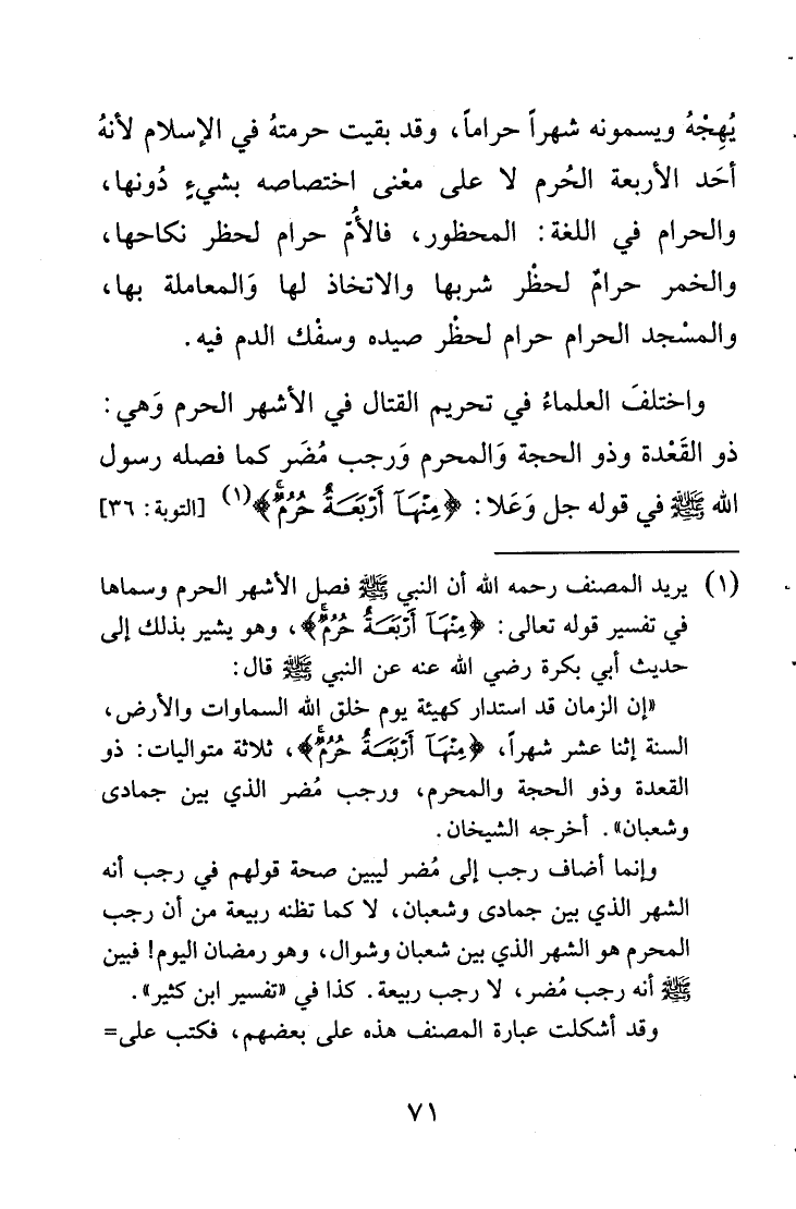 (1) يريد المصنف رحمه الله أن النبي - صلى الله عليه وسلم - فصل الأشهر الحرم وسماها في تفسير قوله تعالى: (مِنْهَا أَرْبَعَةٌ حُرُمٌ) ، وهو يشير بذلك إلى حديث أبي بكرة رضي الله عنه عن النبي - صلى الله عليه وسلم - قال: "إن الزمان قد استدار كهيئة يوم خلق الله السماوات والأرض، السنة إثنا عثر شهراَ، (مِنْهَا أَرْبَعَةٌ حُرُمٌ) ، ثلاثة متواليات: ذو القعدة وذو الحجة والمحرم، ورجب مُضر الذي بين جمادى وشعبان". أخرجه الشيخان.