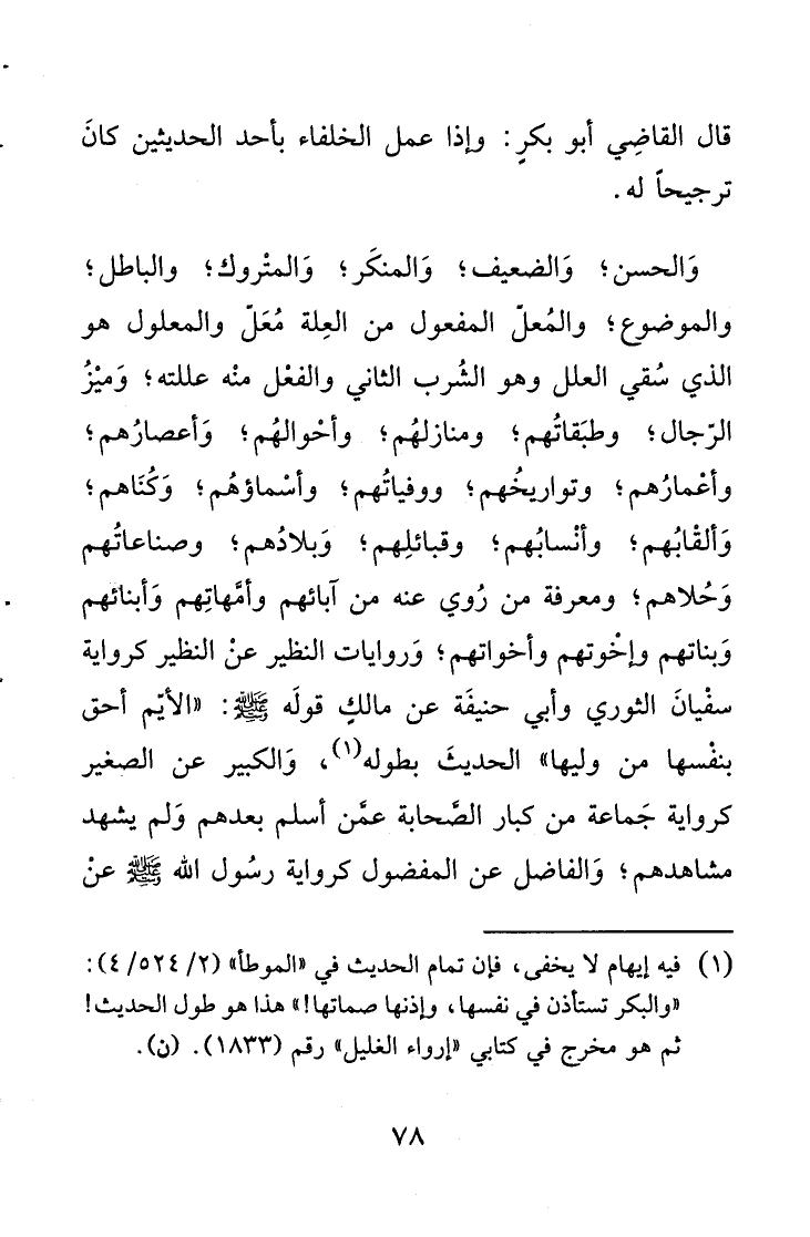وَالحسن؛ وَالضعيف؛ وَالمنكَر؛ وَالمتْروك؛ والباطل؛ والموضوع؛ والمُعلّ المفعول من العِلة مُعَلّ والمعلول هو الذي سُقي العلل وهو الشُرب الثاني والفعْل منْه عللته؛ وَميْزُ الرّجال؛ وطبَقاتُهم؛ ومنازلهُم؛ وأحْوالهُم؛ وَأعصارُهم؛ وأعْمارُهم؛ وتواريخُهم؛ ووفياتُهم؛ وأسْماؤهُم؛ وَكُنَاهم؛ وَألقْابُهم؛ وأنْسابُهم؛ وقبائلِهم؛ وَبلادُهم؛ وصناعاتُهم وَحُلاهم؛ ومعرفة من رُوي عنه من آبائهم وأمَّهاتِهم وَأبنائهم وَبناتهم وإخْوتهم وأخواتهم؛ وَروايات النظير عنْ النظير كرواية سفْيانَ الثوري وأبي حنيفَة عن مالكِ قولَه - صلى الله عليه وسلم -: "الأيّم أحق بنفْسها من وليها" الحديثَ بطوله (1) ، وَالكبير عن الصغير كرواية جَماعة من كبار الصَّحابة عمَّن أسلم بعدهم وَلم يشهد مشاهدهم؛ وَالفاضل عن المفضول كرواية رسُول الله صلى الله عليه وسلم عنْ