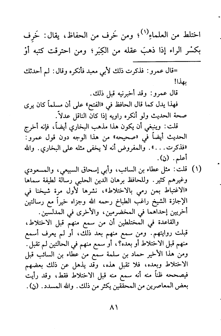 (1) قلت: مثل عطاء بن السائب، وأبي إسحاق السبيعي، والمسعودي وغيرهم كثير. وللحافظ برهان الدين الحلبي رسالة لطيفة سماها "الاغتباط بمن رمي بالاختلاط"، نشرها لأول مرة شيخنا في الإجازة الشيخ راغب الطباخ رحمه الله وجزاه خيراً مع رسالتين أخريين إحداهما في المخضرمين، والأخرى في المدلسين.