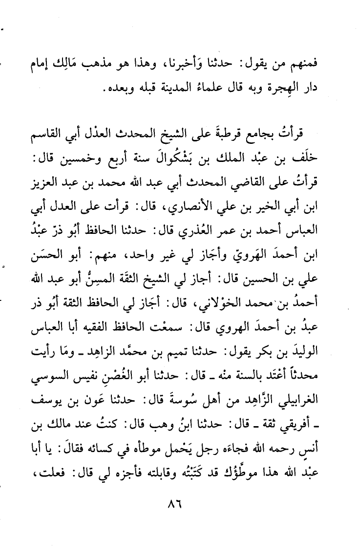 قرأتُ بجامع قرطبةَ على الشيخ المحدث العدْل أبي القاسم خلَف بن عبْد الملك بن بَشْكُوالَ سنة أربع وخمسين قال: قرأتُ على القاضي المحدث أبي عبد الله محمد بن عبد العزيز ابن أبي الخير بن علي الأنصاري، قال: قرأت على العدل أبي العباس أحمد بن عمر العُذري قال؟ حدثنا الحافظ أبُو ذرّ عبْدُ ابن أحمدَ الهَرويّ وأجَاز لي غير واحد، منهم: أبو الحسَن علي بن الحسين قال: أجاز لي الشيخ الثقَة المسِنُّ -أبو عبد الله أحمدُ بن محمد الخوْلاني، قال: أجَاز لي الحافظ الثقة أبُو ذر عبدُ بن أحمدَ الهروي قال: سمعْت الحافظ الفقيه أبا العباس الوليدَ بن بكر يقول: حدثنا تميم بن محمَّد الزاهِد- ومَا رأيت محدثاً أعْتَد بالسنة منْه- قال: حدثنا أبو الغُصْنِ نفيس السوسي الغرابيلي الزَّاهِد من أهل سُوسةَ قال: حدثنا عَون بن يوسف -أفريقي ثقة- قال: حدثنا ابنُ وهب قال: كنتُ عند مالك بن أنسِ رحمه الله فجاءَه رجل يَحْمل موطأه في كسائه فقالَ: يا أبا عبْد الله هذا موطَؤُك قد كَتَبْتُه وقابلته فأجزه لي قال: فعلت،