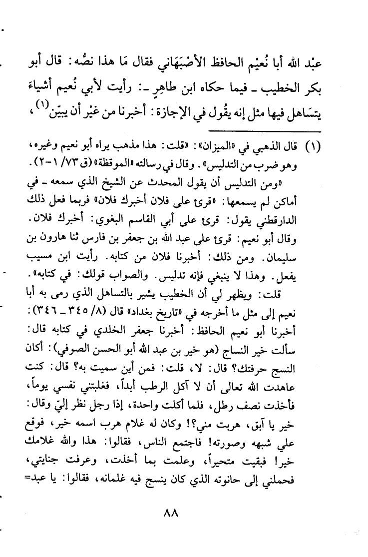 قلت: ويظهر لي أن الخطيب يشير بالتساهل الذي رمى به أبا نعيم إلى مثل ما أخرجه في "تاريخ بغداد" قال (8/ 345- 346) : أخبرنا أبو نعيم الحافظ: أخبرنا جعفر الخلدي في كتابه قال: سألت خير النساج (هو خير بن عبد الله أبو الحسن الصوفي) : اْكان النسج حرفتك؟ قال: لا، قلت: فمن أين سميت به؟ قال: كنت عاهدت الله تعالى أن لا آكل الرطب أبداً، فغلبتني نفسي يوماً، فاخذت نصف رطل، فلما أكلت واحدة، إذا رجل نظر إليّ وقال: خير يا آبق، هربت مني؟! وكان له غلام هرب اسمه خير، فوقع علي شبهه وصورته! فاجتمع الناس، فقالوا: هذا والله غلامك خير! فبقيت متحيراً، وعلمت بما أخذت، وعرفت جنايتي، فحملني إلى حانوته الذي كان ينسج فيه غلمانه، فقالوا: يا عبد=