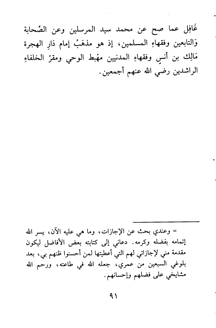 = وعندي بحث عن الإجازات، وما هي عليه الآن، يسر الله إتمامه بفضله وكرمه. دعاني إلى كتابته بعض الأفاضل ليكون مقدمة مني لإجازاتي لهم التي أعطيتها لمن أحسنوا ظنهم بي، بعد بلوغي السبعين من عمري، جعله الله في طاعته، ورحم الله مشايخي على فضلهم وإحسانهم.