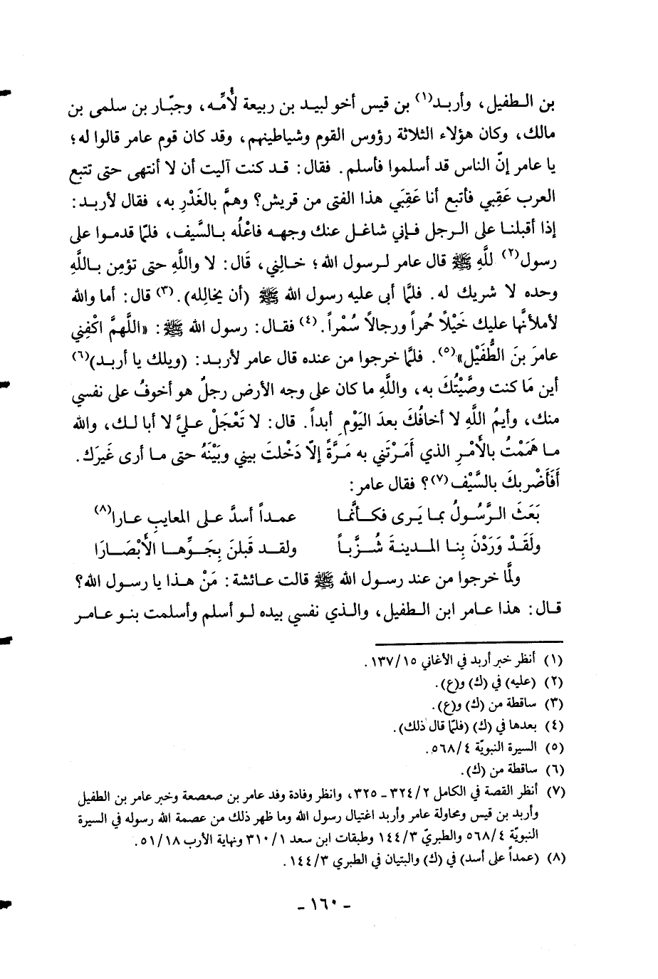 بن الطُّفَيْل واربد بن قيس اخو لبيد بن ربيعَة لأمه وجبار بن سلمى بن مَالك وَكَانَ هَؤُلَاءِ الثَّلَاثَة رُؤُوس الْقَوْم وشياطينهم وَقد كَانَ قوم عَامر قَالُوا لَهُ يَا عَامر أَن النَّاس قد اسلموا فَأسلم فَقَالَ قد كنت آلَيْت أَن لَا انْتهى حَتَّى تتبع الْعَرَب عَقبي فأتبع انا عَقبي هَذَا الْفَتى من قُرَيْش وهم بالغدر بِهِ فَقَالَ لأربد إِذا اقبلنا على الرجل فَإِنِّي شاغل عَنْك وَجهه فَاعله بِالسَّيْفِ فَلَمَّا قدمُوا على رَسُول الله صلى الله عَلَيْهِ وَسلم قَالَ عَامر لرَسُول الله خالني قَالَ لَا وَالله حَتَّى تؤمن بِاللَّه وَحده لَا شريك لَهُ فَلَمَّا ابى عَلَيْهِ رَسُول الله صلى الله عَلَيْهِ وَسلم أَن يخالله قَالَ إِمَّا وَالله لأَمْلَأَنهَا عَلَيْك خيلا حمرا ورجالا سمرا فَقَالَ رَسُول الله صلى الله عَلَيْهِ وَسلم اللَّهُمَّ اكْفِنِي عَامر بن الطُّفَيْل فَلَمَّا خَرجُوا من عِنْده قَالَ عَامر لأربد وَيلك يَا أَرْبَد ايْنَ مَا كنت وصيتك بِهِ وَالله مَا كَانَ على وَجه الأَرْض رجل هُوَ اخوف على نَفسِي مِنْك وَايْم الله لَا اخافك بعد الْيَوْم أبدا قَالَ لَا تعجل عَليّ لَا أَبَا لَك وَالله مَا هَمَمْت بِالْأَمر الَّذِي أَمرتنِي بِهِ مرّة إِلَّا دخلت بيني وَبَينه حَتَّى مَا أرى غَيْرك أفأضربك بِالسَّيْفِ فَقَالَ عَامر