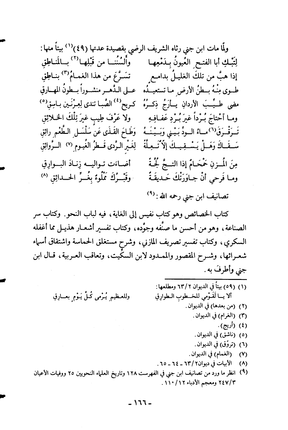 وَلما مَاتَ ابْن جني رثاه الشريف الرضي بقصيدة عدتهَا 49 بَيْتا مِنْهَا