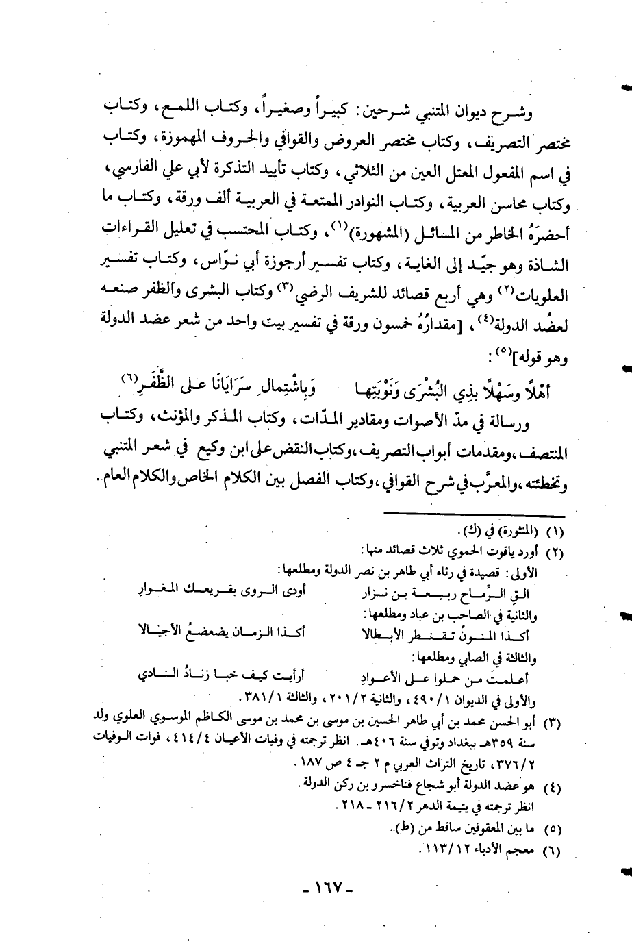وَشرح ديوَان المتنبي شرحين كَبِيرا وصغيرا وَكتاب اللمع وَكتاب مُخْتَصر التصريف وَكتاب مُخْتَصر الْعرُوض والقوافي والحروف المهموزة وَكتاب فِي اسْم الْمَفْعُول المعتل الْعين من الثلاثي وَكتاب تأييد التَّذْكِرَة لابي عَليّ الْفَارِسِي وَكتاب محَاسِن الْعَرَبيَّة وَكتاب النَّوَادِر الممتعة فِي الْعَرَبيَّة ألف ورقة وَكتاب مَا احضره الخاطر من الْمسَائِل الْمَشْهُورَة وَكتاب الْمُحْتَسب فِي تَعْلِيل الْقرَاءَات الشاذة وَهُوَ جيد إِلَى الْغَايَة وَكتاب تَفْسِير ارجوزة أبي نواس وَكتاب تَفْسِير العلويات وَهِي ارْبَعْ قصائد للشريف الرضي وَكتاب الْبُشْرَى وَالظفر صنعه لعضد الدولة مِقْدَاره خَمْسُونَ ورقة فِي تَفْسِير بَيت وَاحِد من شعر عضد الدولة وَهُوَ قَوْله