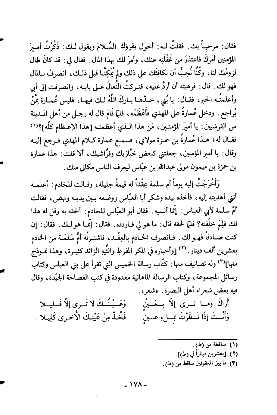 وأخرجت اليه يَوْمًا أم سَلمَة عقدا لَهُ قيمَة جليلة وَقَالَت للخادم اعلمه انني أهديته اليه فَأَخذه بِيَدِهِ وشكر أَبَا الْعَبَّاس وَوَضعه بَين يَدَيْهِ ونهض فَقَالَت أم سَلمَة لأبي الْعَبَّاس إِنَّمَا أنسيه فَقَالَ أَبُو الْعَبَّاس للخادم الْحَقْهُ بِهِ وَقل لَهُ هَذَا لَك فَلم خلفته فَلَمَّا لحقه قَالَ مَا هُوَ لي فاردده فَقَالَ إِنَّمَا هُوَ لَك فَقَالَ أَن كنت صَادِقا فَهُوَ لَك فَانْصَرف الْخَادِم بِالْعقدِ فاشترته أم سَلمَة من الْخَادِم بِعشْرين ألف دِينَار واخباره فِي الْمَكْر المفرط والتيه الزَّائِد كَثِيرَة وَهَذَا نموذج مِنْهَا وَله تصانيف مِنْهَا كتاب رِسَالَة الْخَمِيس الَّتِي تقْرَأ على بني الْعَبَّاس وَكتاب رسائل الْمَجْمُوعَة وَكتاب الرسَالَة الماهانية مَعْدُودَة فِي كتب الفصاحة الجيدة وَقَالَ فِيهِ بعض شعراء أهل الْبَصْرَة شعر