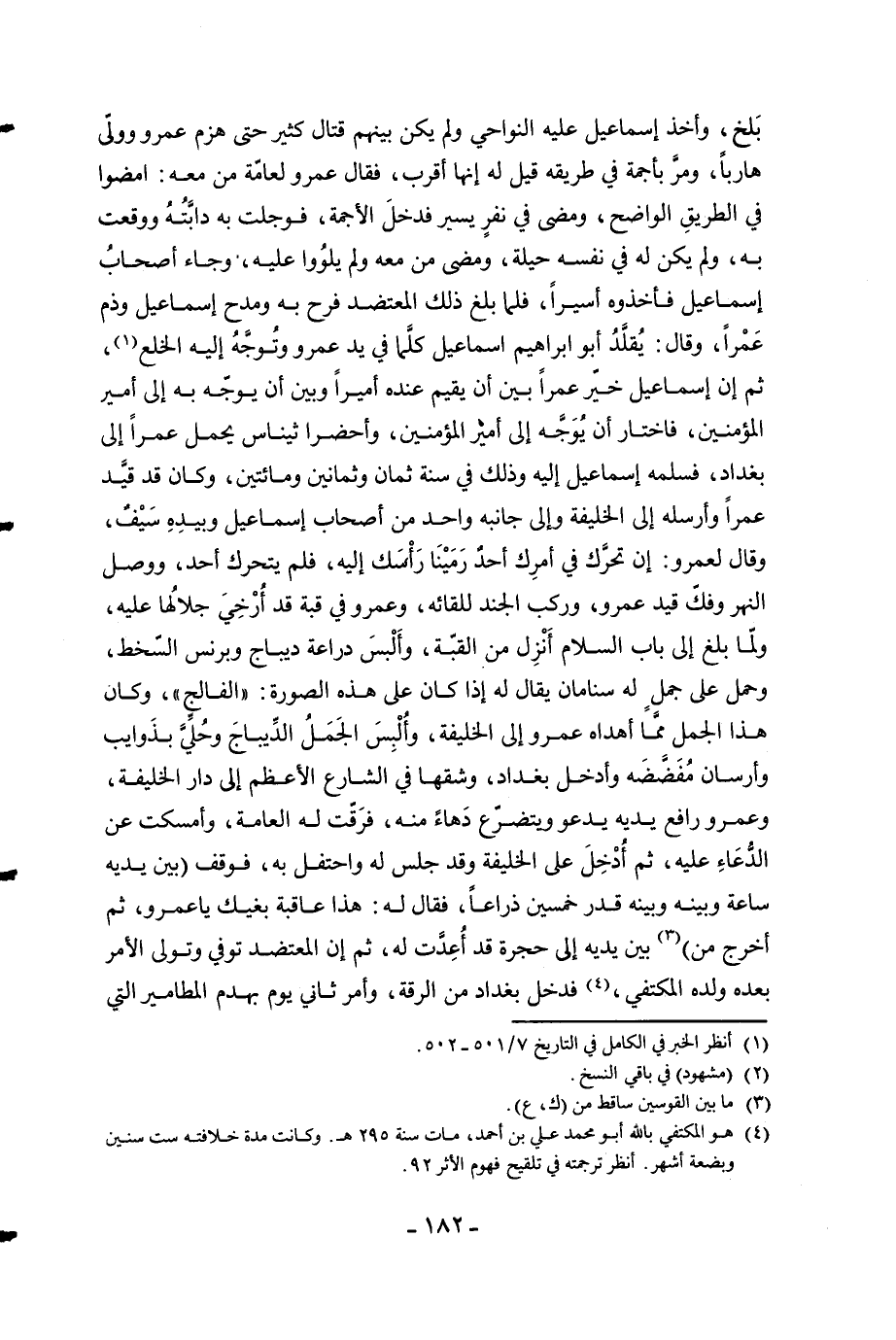 بَلخ واخذ اسماعيل عَلَيْهِ النواحي وَلم يكن بَينهم قتال كثير حَتَّى هزم عَمْرو وَولى هَارِبا وَمر بأجمة فِي طَرِيقه قيل لَهُ إِنَّهَا اقْربْ فَقَالَ عَمْرو لعامة من مَعَه امضوا فِي الطَّرِيق الْوَاضِح وَمضى فِي نفر يسير فَدخل الاجمة فوجلت بِهِ دَابَّته وَوَقعت بِهِ وَلم يكن لَهُ فِي نَفسه حِيلَة وَمضى من مَعَه وَلم يلووا عَلَيْهِ وَجَاء أَصْحَاب اسماعيل فَأَخَذُوهُ اسيرا فَلَمَّا بلغ ذَلِك المعتضد فَرح بِهِ ومدح اسماعيل وذم عمرا وَقَالَ يُقَلّد أَبُو إِبْرَاهِيم اسماعيل كلما فِي يَد عَمْرو وَتوجه اليه الْخلْع ثمَّ أَن اسماعيل خير عمرا بَين أَن يُقيم عِنْده اميرا وَبَين أَن يُوَجه بِهِ إِلَى امير الْمُؤمنِينَ فَاخْتَارَ أَن يُوَجه إِلَى امير الْمُؤمنِينَ واحضرا ثيناس يحمل عمرا إِلَى بَغْدَاد فسلمه اسماعيل اليه وَذَلِكَ فِي سنة ثَمَان وَثَمَانِينَ وَمِائَتَيْنِ وَكَانَ قد قيد عمرا وأرسله إِلَى الْخَلِيفَة والى جَانِبه وَاحِد من اصحاب اسماعيل وَبِيَدِهِ سيف وَقَالَ لعَمْرو أَن تحرّك فِي أَمرك أحد رمينَا رَأسك اليه فَلم يَتَحَرَّك أحد وَوصل النَّهر وَفك قيد عَمْرو وَركب الْجند للقائه وَعَمْرو فِي قبَّة قد ارخى جلالها عَلَيْهِ وَلما بلغ إِلَى بَاب السَّلَام انْزِلْ من الْقبَّة والبس دراعة ديباج وبرنس السخط وَحمل على جمل لَهُ سنامان يُقَال لَهُ إِذا كَانَ على هَذِه الصُّورَة الفالج وَكَانَ هَذَا الْجمل مِمَّا اهداه عَمْرو إِلَى الْخَلِيفَة والبس الْجمل الديباج وحلي بذوايب وارسان مفضضه وادخل بَغْدَاد وشقها فِي الشَّارِع الاعظم إِلَى دَار الْخَلِيفَة وَعَمْرو رَافع يَدَيْهِ يَدْعُو ويتضرع دهاءا مِنْهُ فرقت لَهُ الْعَامَّة وامسكت عَن الدُّعَاء عَلَيْهِ ثمَّ ادخل على الْخَلِيفَة وَقد جلس لَهُ واحتفل بِهِ فَوقف بَين يَدَيْهِ سَاعَة وَبَينه وَبَينه قدر خمسين ذِرَاعا فَقَالَ لَهُ هَذَا عَاقِبَة بغيك يَا عَمْرو ثمَّ اخْرُج من بَين يَدَيْهِ إِلَى حجرَة قد أعدت لَهُ ثمَّ أَن المعتضد توفّي وَتَوَلَّى الْأَمر بعده وَلَده المكتفي فَدخل بَغْدَاد من الرقة وامر ثَانِي يَوْم بهدم المطامير الَّتِي