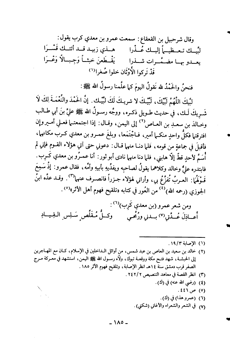 لبيْك اللَّهُمَّ لبيْك لبيْك لَا شريك لَك لبيْك أَن الْحَمد وَالنعْمَة لَك لَا شريك لَك فِي حَدِيث طَوِيل ذكره وَوجه رَسُول الله صلى الله عَلَيْهِ وَسلم عَليّ بن أبي طَالب وخَالِد بن سعد بن الْعَاصِ إِلَى الْيمن وَقَالَ إِذا اجتمعتما فعلي امير وان افترقتما فَكل وَاحِد مِنْكُمَا امير فاجتمعا وَبلغ عَمْرو بن معدي كرب مكانهما فَأقبل فِي جمَاعَة من قومه فَلَمَّا دنا مِنْهُمَا قَالَ دَعونِي حَتَّى آتِي هَؤُلَاءِ الْقَوْم فَإِنِّي لم اسْم لأحد قطّ الا هابني فَلَمَّا دنا مِنْهُمَا نَادَى أَبُو ثَوْر انا عَمْرو بن معدي كرب فَابْتَدَرَهُ عَليّ وخَالِد وَكِلَاهُمَا يَقُول لصَاحبه ويفديه بِأَبِيهِ وَأمه فَقَالَ عَمْرو إِذْ سمع قَوْلهمَا الْعَرَب تفزع بِي واراني لهَؤُلَاء جزرا فَانْصَرف عَنْهُمَا وَقد عده ابْن الْجَوْزِيّ رَحمَه الله من العور فِي كِتَابه تلقيح فهوم أهل الاثر