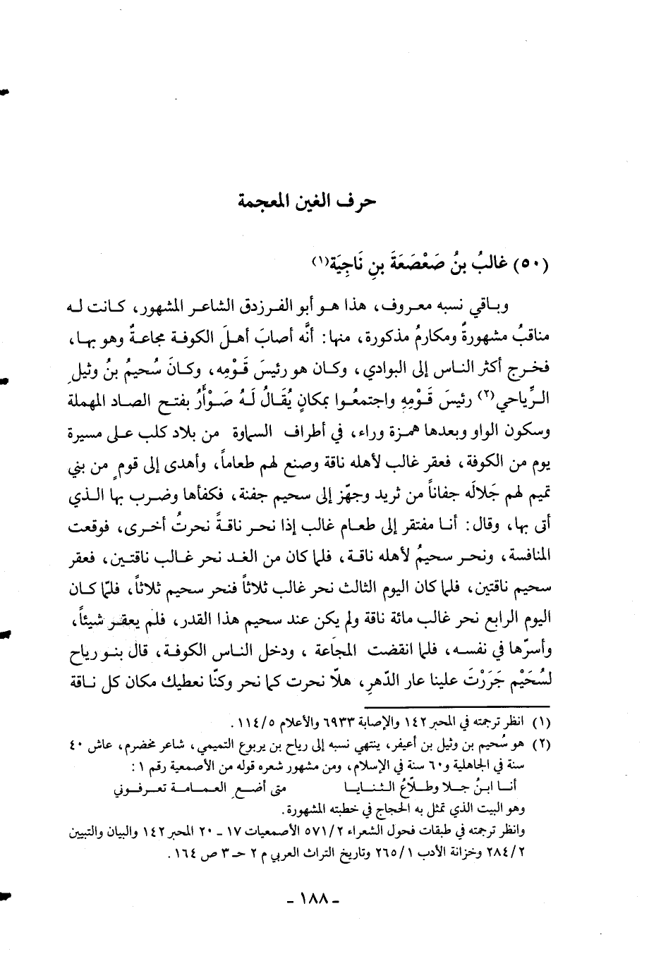 وَبَاقِي نسبه مَعْرُوف هَذَا هُوَ أَبُو الفرزدق الشَّاعِر الْمَشْهُور كَانَت لَهُ مَنَاقِب مَشْهُورَة وَمَكَارِم مَذْكُورَة مِنْهَا انه اصاب أهل الْكُوفَة مجاعَة وَهُوَ بهَا فَخرج اكثر النَّاس إِلَى الْبَوَادِي وَكَانَ هُوَ رَئِيس قومه وَكَانَ سحيم بن وثيل الريَاحي رَئِيس قومه واجتمعوا بمَكَان يُقَال لَهُ صوأر بِفَتْح الصَّاد الْمُهْملَة وَسُكُون الْوَاو وَبعدهَا همزَة وَرَاء فِي أَطْرَاف السماوة من بِلَاد كلب على مسيرَة يَوْم من الْكُوفَة فعقر غَالب لأَهله نَاقَة وصنع لَهُم طَعَاما وَأهْدى إِلَى قوم من بني تَمِيم لَهُم جَلَاله جفانا من ثريد وجهز إِلَى سحيم جَفْنَة فكفأها وَضرب بهَا الَّذِي أَتَى بهَا وَقَالَ انا مفتقر إِلَى طَعَام غَالب إِذا نحر نَاقَة تحرت أُخْرَى فَوَقَعت المنافسة وَنحر سحيم لأَهله نَاقَة فَلَمَّا كَانَ من الْغَد نحر غَالب ناقتين فعقر سحيم ناقتين فَلَمَّا كَانَ الْيَوْم الثَّالِث نحر غَالب ثَلَاثًا فَنحر سحيم ثَلَاثًا فَلَمَّا كَانَ الْيَوْم الرَّابِع نحر غَالب مائَة نَاقَة وَلم يكن عِنْد سحيم هَذَا الْقدر فَلم يعقر شَيْئا واسرها فِي نَفسه فَلَمَّا انْقَضتْ المجاعة وَدخل النَّاس الْكُوفَة قَالَ بَنو ريَاح لسحيم جررت علينا عَار الدَّهْر هلا نحرت كَمَا نحر وَكُنَّا نعطيك مَكَان كل نَاقَة