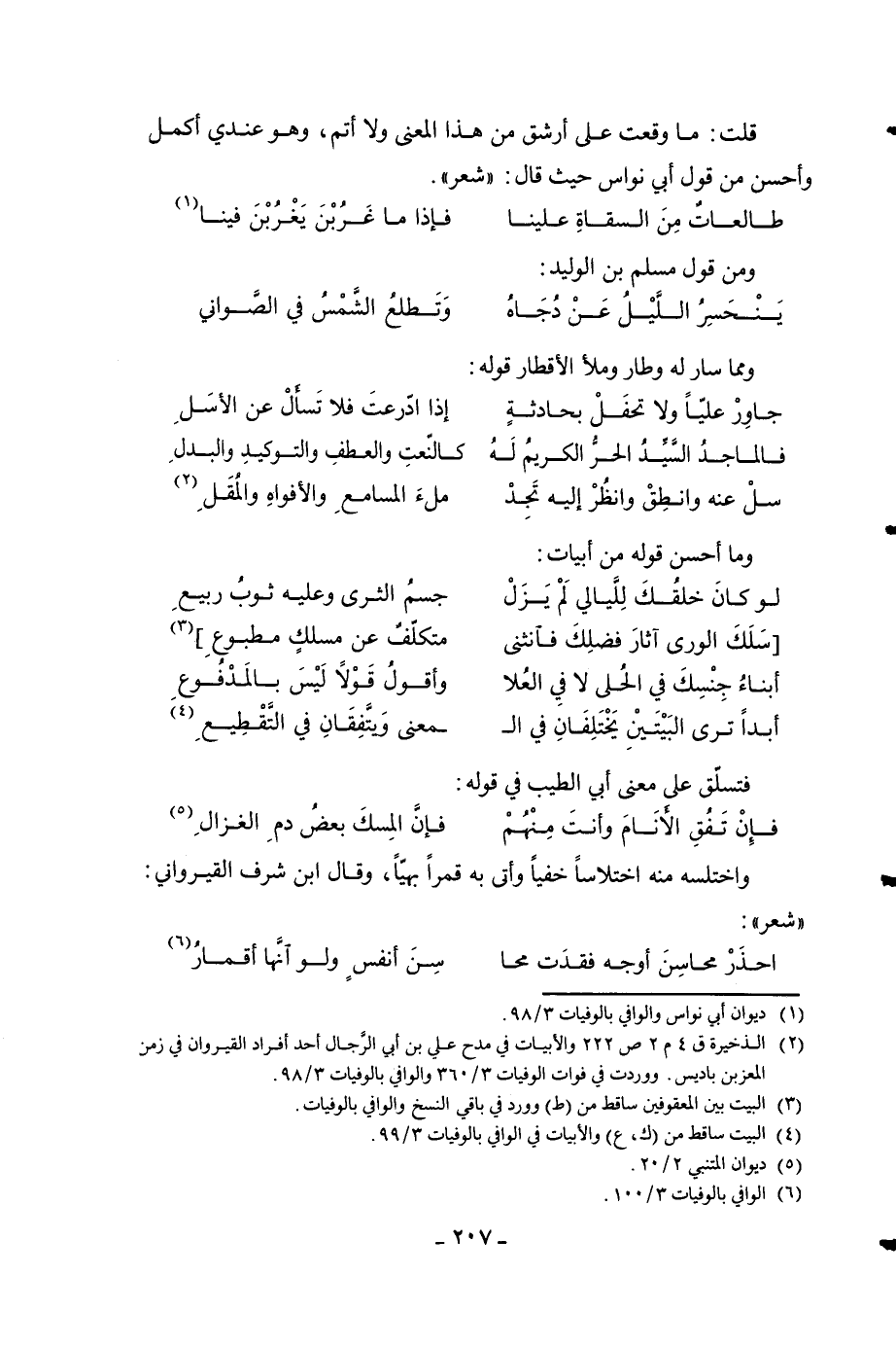 قلت مَا وَقعت على ارشق من هَذَا الْمَعْنى وَلَا اتم وَهُوَ عِنْدِي اكمل واحسن من قَول أبي نواس حَيْثُ قَالَ شعر