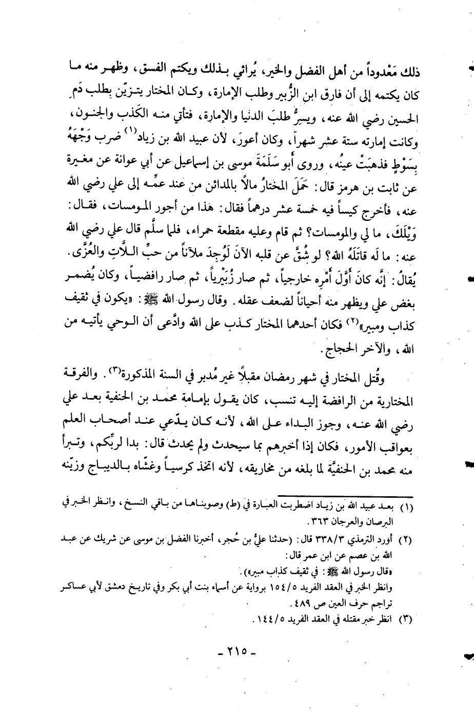 ذَلِك معدودا من أهل الْفضل وَالْخَيْر يرائي بذلك ويكتم الْفسق وَظهر مِنْهُ مَا كَانَ يَكْتُمهُ إِلَى أَن فَارق ابْن الزبير وَطلب الامارة وَكَانَ الْمُخْتَار يتزين بِطَلَب دم الْحُسَيْن رَضِي الله عَنهُ وَيسر طلب الدُّنْيَا والامارة فتأتي مِنْهُ الْكَذِب وَالْجُنُون وَكَانَت امارته سِتَّة عشر شهرا وَكَانَ اعور لَان عبيد الله بن زِيَاد ضرب وَجهه بِسَوْط فَذَهَبت عينه وروى أَبُو سَلمَة مُوسَى بن اسماعيل عَن أبي عوَانَة عَن مُغيرَة عَن ثَابت بن هُرْمُز قَالَ حمل الْمُخْتَار مَالا بِالْمَدَائِنِ من عِنْد عَمه إِلَى عَليّ رَضِي الله عَنهُ فَأخْرج كيسا فِيهِ خَمْسَة عشر درهما فَقَالَ هَذَا من اجور المومسات فَقَالَ وَيلك مَا لي والمومسات ثمَّ قَامَ وَعَلِيهِ مقطعَة حَمْرَاء فَلَمَّا سلم قَالَ عَليّ رَضِي الله عَنهُ مَا لَهُ قَاتله الله لَو شقّ عَن قلبه الان لوجد ملآنا من حب اللات والعزى يُقَال انه كَانَ أول امْرَهْ خارجيا ثمَّ صَار زبيريا ثمَّ صَار رَافِضِيًّا وَكَانَ يضمر بغض عَليّ وَيظْهر مِنْهُ احيانا لضعف عقله وَقَالَ رَسُول الله صلى الله عَلَيْهِ وَسلم يكون فِي ثَقِيف كَذَّاب ومبير فَكَانَ أَحدهمَا الْمُخْتَار كذب على الله وَادّعى أَن الْوَحْي يَأْتِيهِ من الله وَالْآخر الْحجَّاج