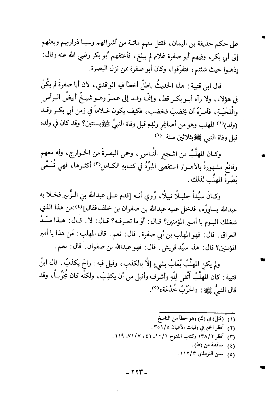 قَالَ ابْن قُتَيْبَة هَذَا الحَدِيث بَاطِل اخطأ فِيهِ الْوَاقِدِيّ لِأَن أَبَا صفرَة لم يكن فِي هَؤُلَاءِ وَلَا رَآهُ أَبُو بكر قطّ وانما وَفد إِلَى عمر وَهُوَ شيخ ابيض الرَّأْس واللحية فَأمره أَن يخضب فَخَضَّبَ فَكيف يكون غُلَاما فِي زمن أبي بكر وَقد ولد الْمُهلب وَهُوَ من اصاغر وَلَده قبل وَفَاة النَّبِي صلى الله عَلَيْهِ وَسلم بِسنتَيْنِ وَقد كَانَ فِي وَلَده قبل وَفَاة النَّبِي صلى الله عَلَيْهِ وَسلم بِثَلَاثِينَ سنة