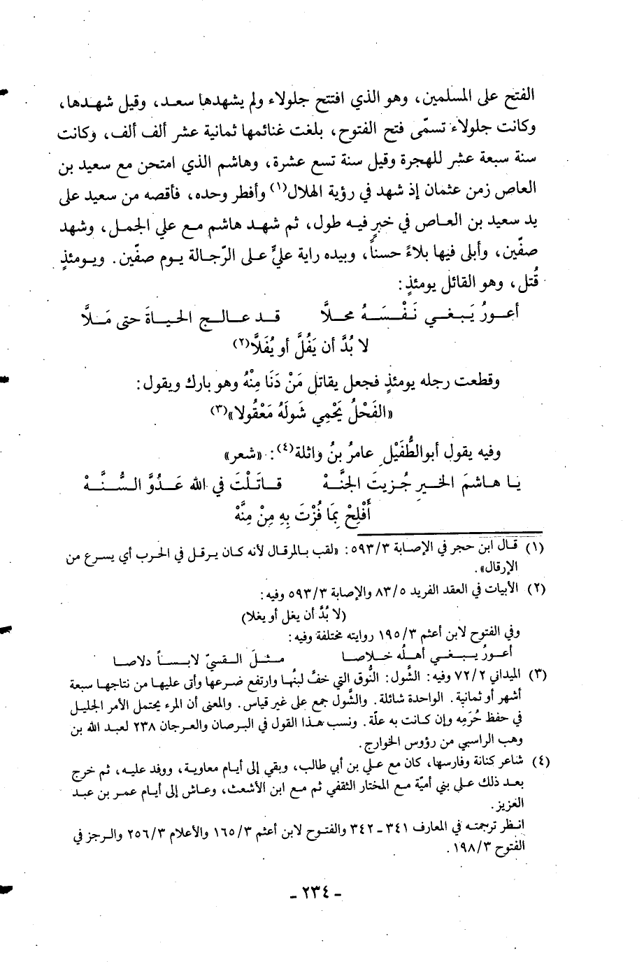 الْفَتْح على الْمُسلمين وَهُوَ الَّذِي افْتتح جَلُولَاء وَلم يشهدها سعد وَقيل شَهِدَهَا وَكَانَت جَلُولَاء تسمى فتح الْفتُوح بلغت غنائمها ثَمَانِيَة عشر ألف ألف وَكَانَت سنة سَبْعَة عشر لِلْهِجْرَةِ وَقيل سنة تسع عشرَة وهَاشِم الَّذِي امتحن مَعَ سعيد بن الْعَاصِ زمن عُثْمَان إِذْ شهد فِي رُؤْيَة الْهلَال وافطر وَحده فأقصه من سعيد على يَد سعيد بن الْعَاصِ فِي خبر فِيهِ طول ثمَّ شهد هَاشم مَعَ عَليّ الْجمل وَشهد صفّين وأبلى فِيهَا بلَاء حسنا وَبِيَدِهِ راية عَليّ على الرجالة يَوْم صفّين ويومئذ قتل وَهُوَ الْقَائِل يَوْمئِذٍ