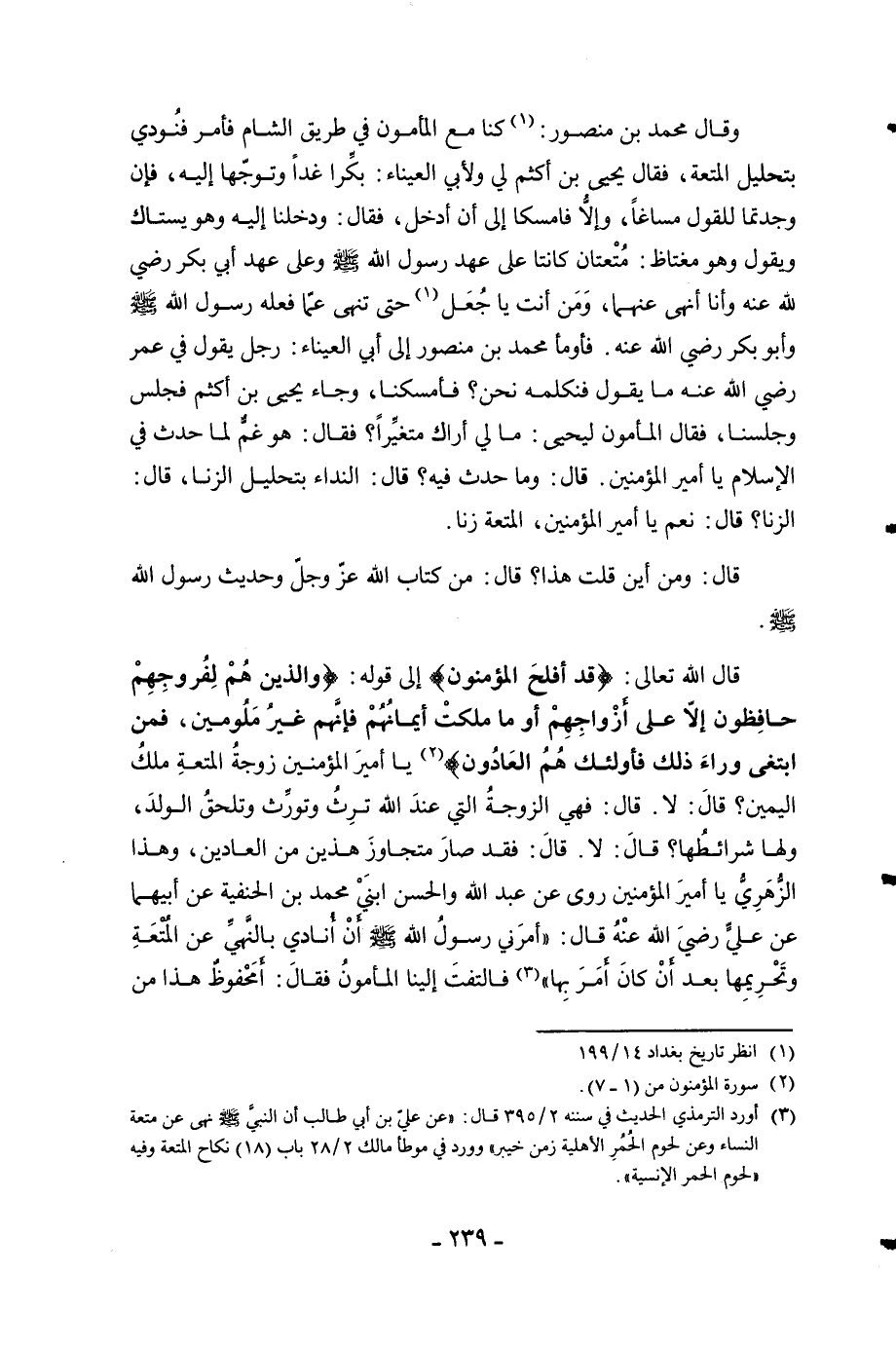 قَالَ الله تَعَالَى {قد أَفْلح الْمُؤْمِنُونَ} إِلَى قَوْله {وَالَّذين هم لفروجهم حافظون إِلَّا على أَزوَاجهم أَو مَا ملكت أَيْمَانهم فَإِنَّهُم غير ملومين فَمن ابْتغى وَرَاء ذَلِك فَأُولَئِك هم العادون} يَا أَمِير الْمُؤمنِينَ زَوْجَة الْمُتْعَة ملك الْيَمين قَالَ لَا قَالَ فَهِيَ الزَّوْجَة الَّتِي عِنْد الله تَرث وتورث وتلحق الْوَلَد وَلها شرائطها قَالَ لَا قَالَ فقد صَار متجاوز هذَيْن من العادين وَهَذَا الزُّهْرِيّ يَا أَمِير الْمُؤمنِينَ روى عَن عبد الله وَالْحسن ابْني مُحَمَّد بن الْحَنَفِيَّة عَن ابيهما عَن عَليّ رَضِي الله عَنهُ قَالَ أَمرنِي رَسُول الله صلى الله عَلَيْهِ وَسلم أَن انادي بِالنَّهْي عَن الْمُتْعَة وتحريمها بعد أَن كَانَ أَمر بهَا فَالْتَفت الينا الْمَأْمُون فَقَالَ امحفوظ هَذَا من