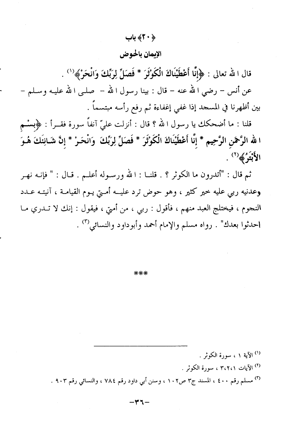 ثم قال: «أتدرون ما الكوثر»؟ قلنا: الله ورسوله أعلم. قال: «فإنه نهر وعدنيه ربي عليه خير كثير، وهو حوض ترد عليه أمتي يوم القيامة، آنيته عدد النجوم، فيختلج العبد منهم، فأقول: ربي، من أمتي، فيقول: إنك لا تدري ما أحدثوا بعدك». رواه مسلم، والإمام أحمد، وأبو داود، والنسائي (¬1).