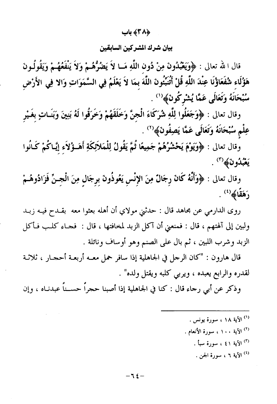 وقال تعالى: {وَجَعَلُوا لِلَّهِ شُرَكَاءَ الْجِنَّ وَخَلَقَهُمْ وَخَرَقُوا لَهُ بَنِينَ وَبَنَاتٍ بِغَيْرِ عِلْمٍ سُبْحَانَهُ وَتَعَالَى عَمَّا يَصِفُونَ} [الأنعام: 100].