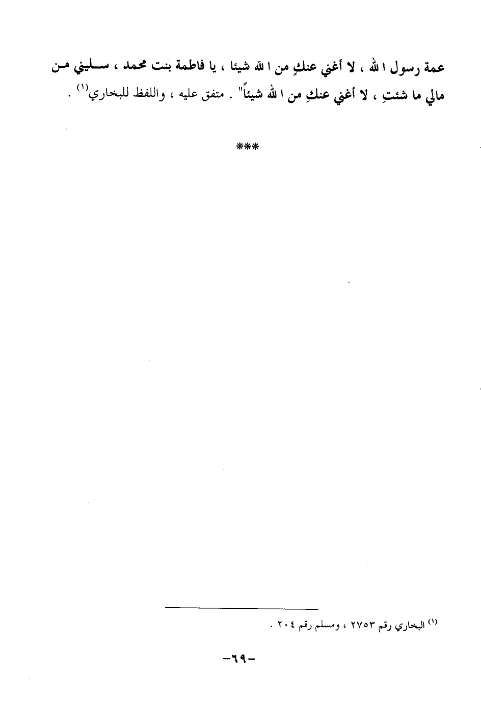 عمة رسول الله، لا أغني عنك من الله شيئا، يا فاطمة بنت محمد، سليني من مالي ما شئت، لا أغني عنك من الله شيئا». متفق عليه، واللفظ للبخاري (¬1).