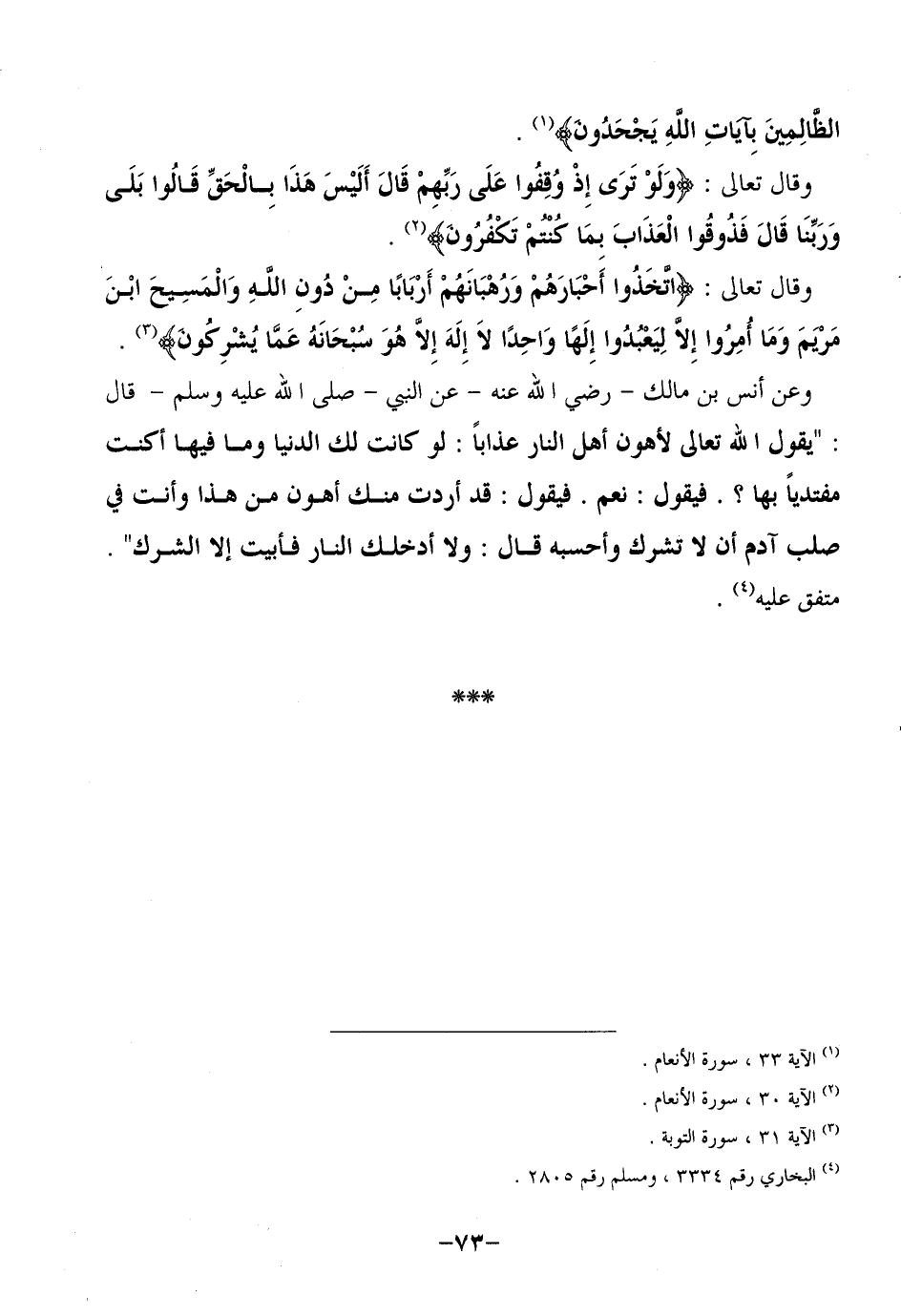 وعن أنس بن مالك رضي الله عنه عن النبي - صلى الله عليه وسلم - قال: «يقول الله تعالى لأهون أهل النار عذابا: لو كانت لك الدنيا وما فيها أكنت مفتديا بها؟ فيقول: نعم، فيقول: قد أردت منك أهون من هذا وأنت في صلب آدم أن لا تشرك ـ وأحسبه قال: ولا أدخلك النار ـ فأبيت إلا الشرك». متفق عليه (¬1).