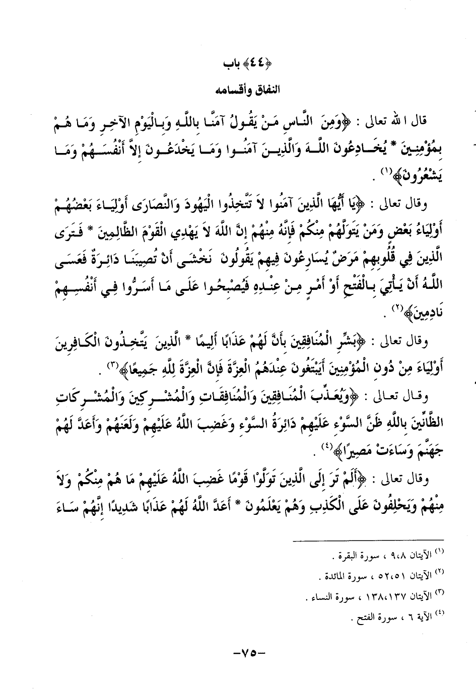 وقال تعالى: {يَا أَيُّهَا الَّذِينَ آَمَنُوا لَا تَتَّخِذُوا الْيَهُودَ وَالنَّصَارَى أَوْلِيَاءَ بَعْضُهُمْ أَوْلِيَاءُ بَعْضٍ وَمَنْ يَتَوَلَّهُمْ مِنْكُمْ فَإِنَّهُ مِنْهُمْ إِنَّ اللَّهَ لَا يَهْدِي الْقَوْمَ الظَّالِمِينَ * فَتَرَى الَّذِينَ فِي قُلُوبِهِمْ مَرَضٌ يُسَارِعُونَ فِيهِمْ يَقُولُونَ نَخْشَى أَنْ تُصِيبَنَا دَائِرَةٌ فَعَسَى اللَّهُ أَنْ يَأْتِيَ بِالْفَتْحِ أَوْ أَمْرٍ مِنْ عِنْدِهِ فَيُصْبِحُوا عَلَى مَا أَسَرُّوا فِي أَنْفُسِهِمْ نَادِمِينَ} [المائدة: 51 - 52].