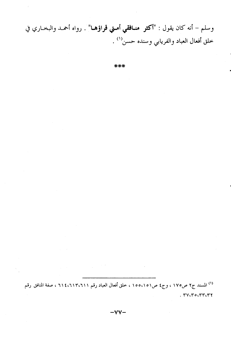 (¬1) المسند (2/ 175، 4/ 151، 155)، خلق أفعال العباد (رقم 611، 613، 614)، صفة المنافق (رقم 32، 33، 35، 37).