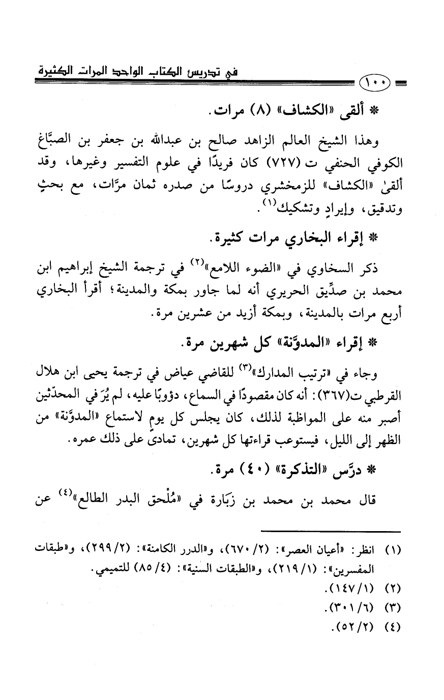 وهذا الشيخ العالم الزاهد صالح بن عبد الله بن جعفر بن الصبَّاغ الكوفي الحنفي ت (727) كان فريدًا في علوم التفسير وغيرها، وقد ألقى ((الكشاف)) للزمخشري دروسًا من صدره ثمان مرَّات، مع بحثٍ وتدقيق، وإيرادٍ وتشكيك (1) .