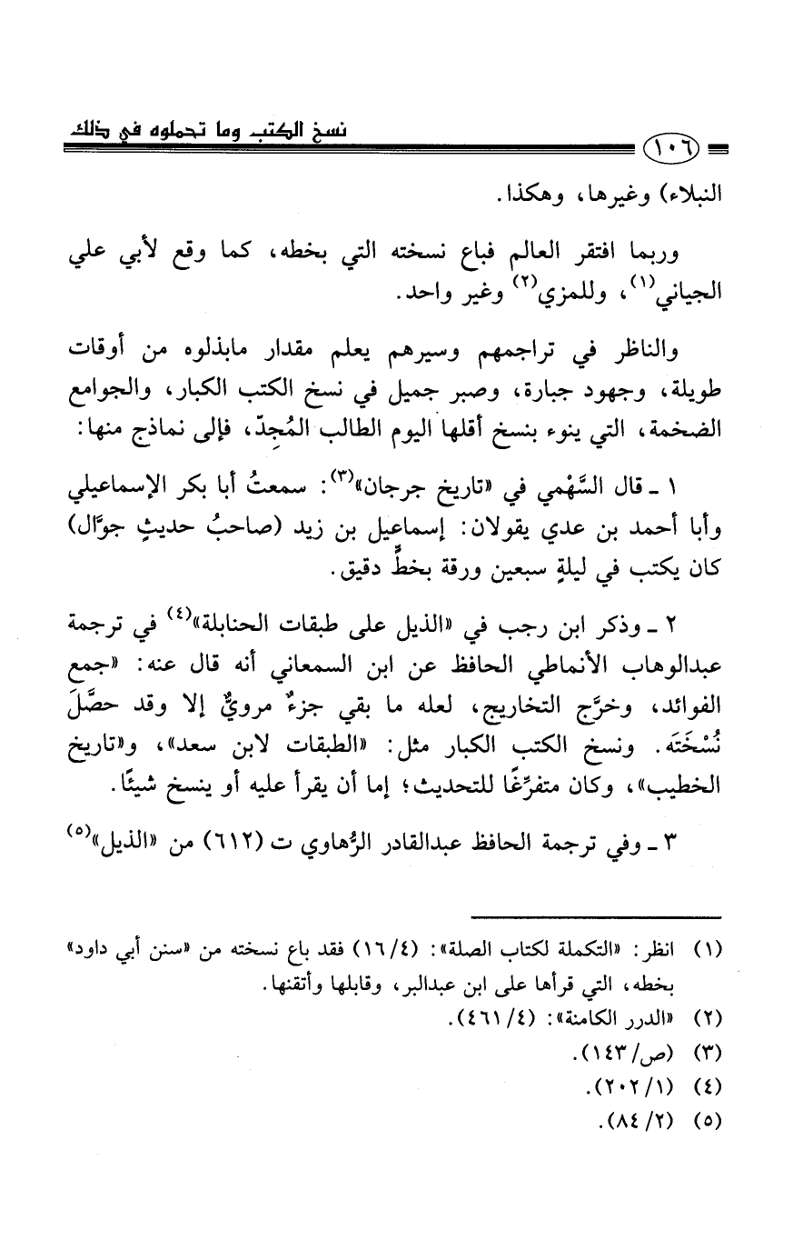 2 - وذكر ابن رجب في ((الذيل على طبقات الحنابلة)) (4) في ترجمة عبد الوهاب الأنماطي الحافظ عن ابن السمعاني أنه قال عنه: ((جمع الفوائد، وخرَّج التخاريج، لعله ما بقي جزءٌ مرويٌّ إلا وقد حصَّلَ نُسْخَتَه. ونسخ الكتب الكبار مثل: ((الطبقات لابن سعد)) ، و ((تاريخ الخطيب)) ، وكان متفرِّغًا للتحديث، إما أن يقرأ عليه أو ينسخ شيئًا.