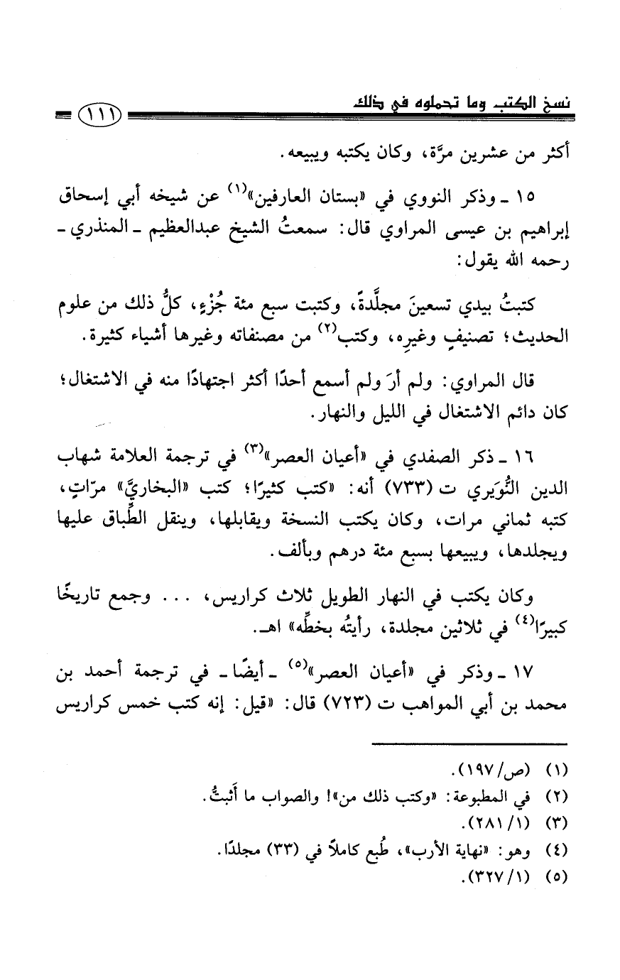 16 - ذكر الصفدي في ((أعيان العصر)) (3) في ترجمة العلامة شهاب الدين النُّوَيري ت (733) أنه: ((كتب كثيرًا، كتب ((البخاري)) مرّاتٍ، كتبه ثماني مرات، وكان يكتب النسخة ويقابلها، وينقل الطِّباق عليها ويجلدها، ويبيعها بسبع مئة درهم وبألف.