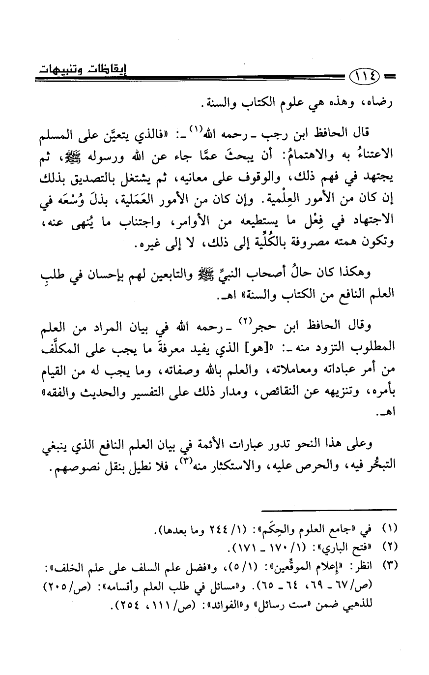 وقال الحافظ ابن حجر (2) -رحمه الله في بيان المراد من العلم المطلوب التزود منه-: (( [هو] الذي يفيد معرفةَ ما يجب على المكلَّف من أمر عباداته ومعاملاته، والعلم بالله وصفاته، وما يجب له من القيام بأمره، وتنزيهه عن النقائص، ومدار ذلك على التفسير والحديث والفقه)) اهـ.
