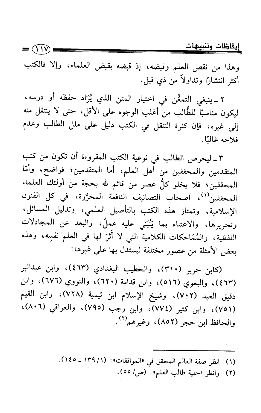 3 - ليحرص الطالب أشدَّ الحرص على كتب المتقدمين والمحققين من أهل العلم، أما المتقدمين، فواضح، وأمّا المحققين، فلا يخلو كلُّ عصر من قائم لله بحجة من أولئك العلماء المحققين (1) ، أصحاب التصانيف النافعة المحرَّرة، في كل الفنون الإسلامية، وتمتاز هذه الكتب بالتأصيل العلمي، وتدليل المسائل، وتحريرها، والاعتناء بما يَنْبَني عليه عملٌ، والبعد عن المجادلات اللفظية، والمُمَاحكات الكلامية التي لا أثر لها في العلم نفسِه، وهذه بعض الأمثلة من عصور مختلفة ليستدل بها على غيرها:
