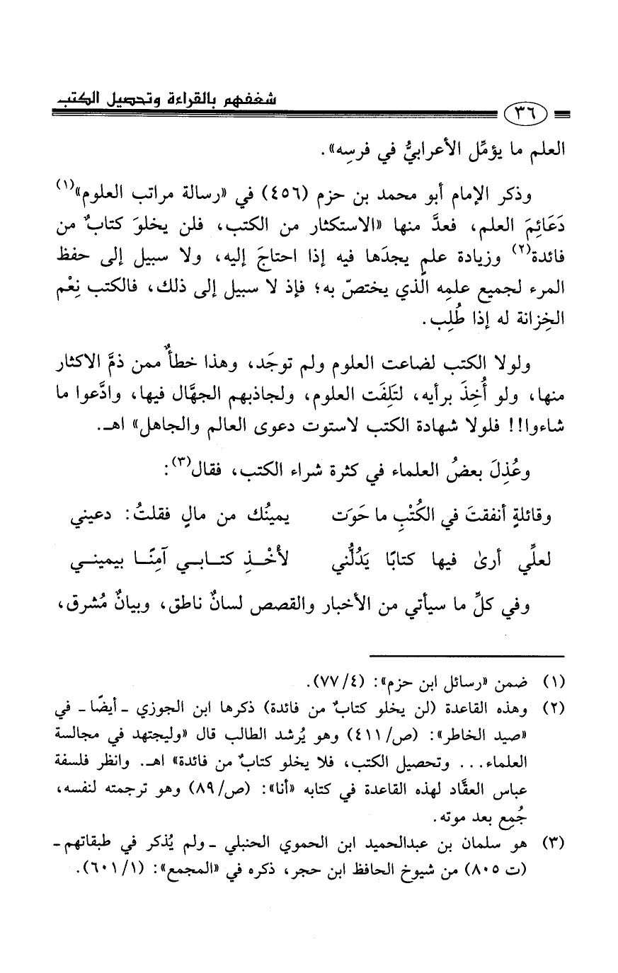 (2) وهذه القاعدة (لن يخلو كتابٌ من فائدة) ذكرها ابن الجوزي -أيضًا- في ((صيد الخاطر)) : (ص/ 411) وهو يُرشد الطالب قال ((وليجتهد في مجالسة العلماء ... وتحصيل الكتب، فلا يخلو كتابٌ من فائدة)) اهـ. وانظر فلسفة عباس العقَّاد لهذه القاعدة في كتابه ((أنا)) : (ص/ 89) وهو ترجمته لنفسه، جُمِع بعد موته. وذكرها وفصل القول فيها الأستاذ محمود الطناحي في ((الموجز)) : (ص/ 24- 35) وهو مهم.
