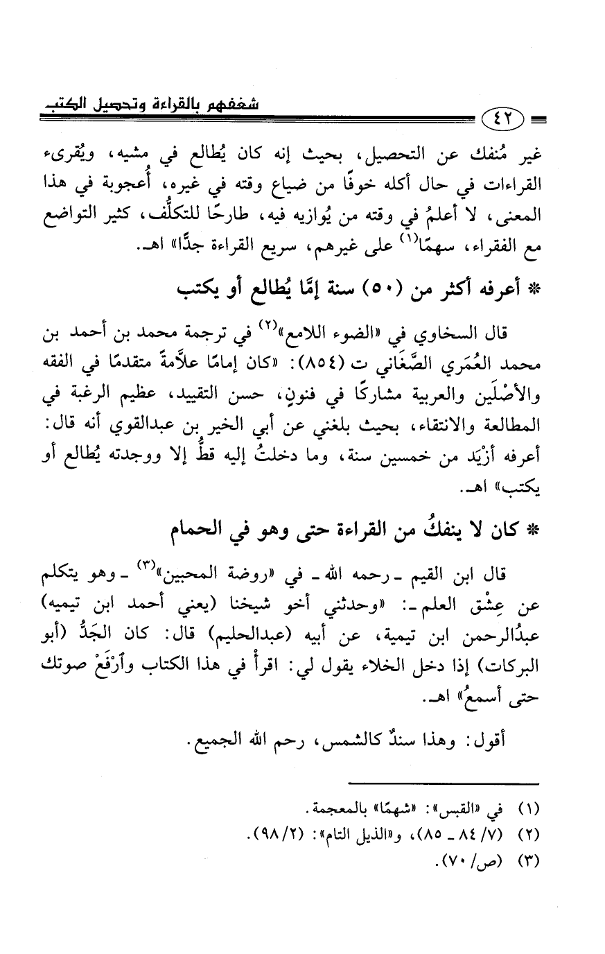 قال السخاوي في ((الضوء اللامع)) (2) في ترجمة محمد بن أحمد ابن محمد العُمَري الصَّغَاني ت (854) : ((كان إمامًا علاَّمةً متقدمًا في الفقه والأصْلَين والعربية مشاركًا في فنونٍ، حسن التقييد، عظيم الرغبة في المطالعة والانتقاء، بحيث بلغني عن أبي الخير بن عبد القوي أنه قال: أعرفه أزْيَد من خمسين سنة، وما دخلتُ إليه قطُّ إلا ووجدته يُطالع أو يكتب)) اهـ.
