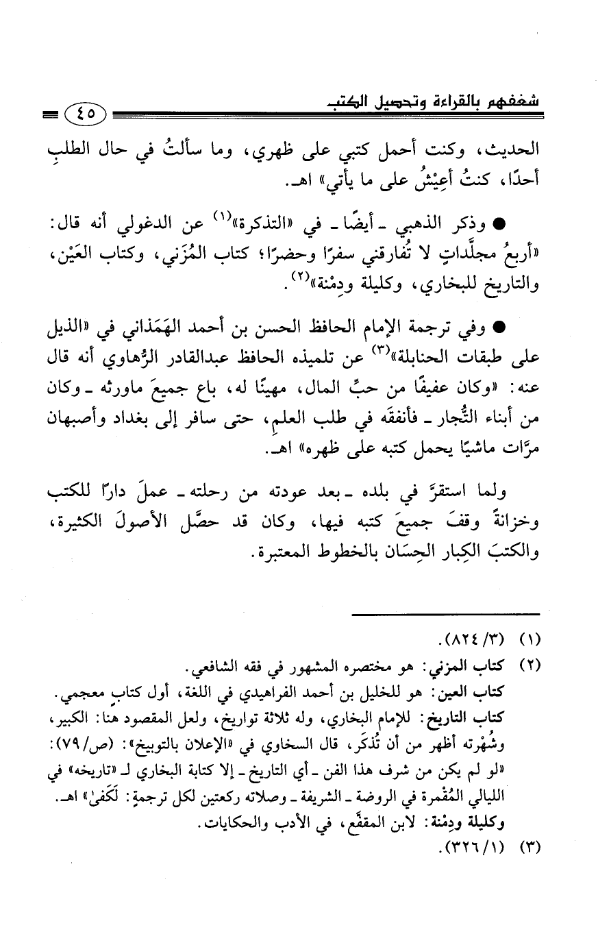 • وذكر الذهبي -أيضًا- في ((التذكرة)) (1) عن الدغولي أنه قال: ((أربعُ مجلَّداتٍ لا تُفارقني سفرًا وحضرًا، كتاب المُزَني، وكتاب العَيْن، والتاريخ للبخاري، وكليلة ودِمْنة)) (2) .