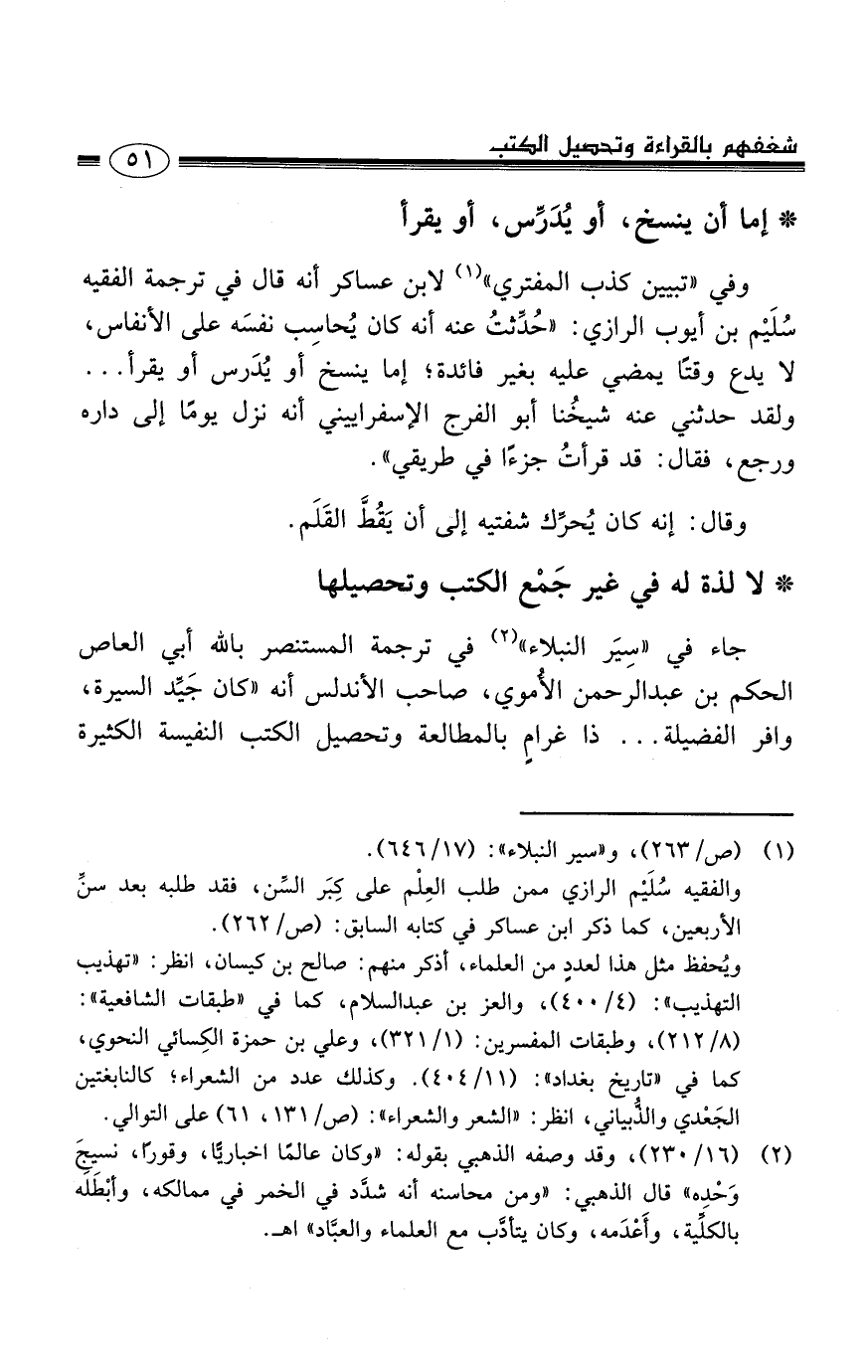 جاء في ((سِيَر النبلاء)) (2) في ترجمة المستنصر بالله أبي العاص الحكم بن عبد الرحمن الأُموي، صاحب الأندلس أنه ((كان جَيِّد السيرة، وافر الفضيلة ... ذا غرامٍ بالمطالعة وتحصيل الكتب النفيسة الكثيرة