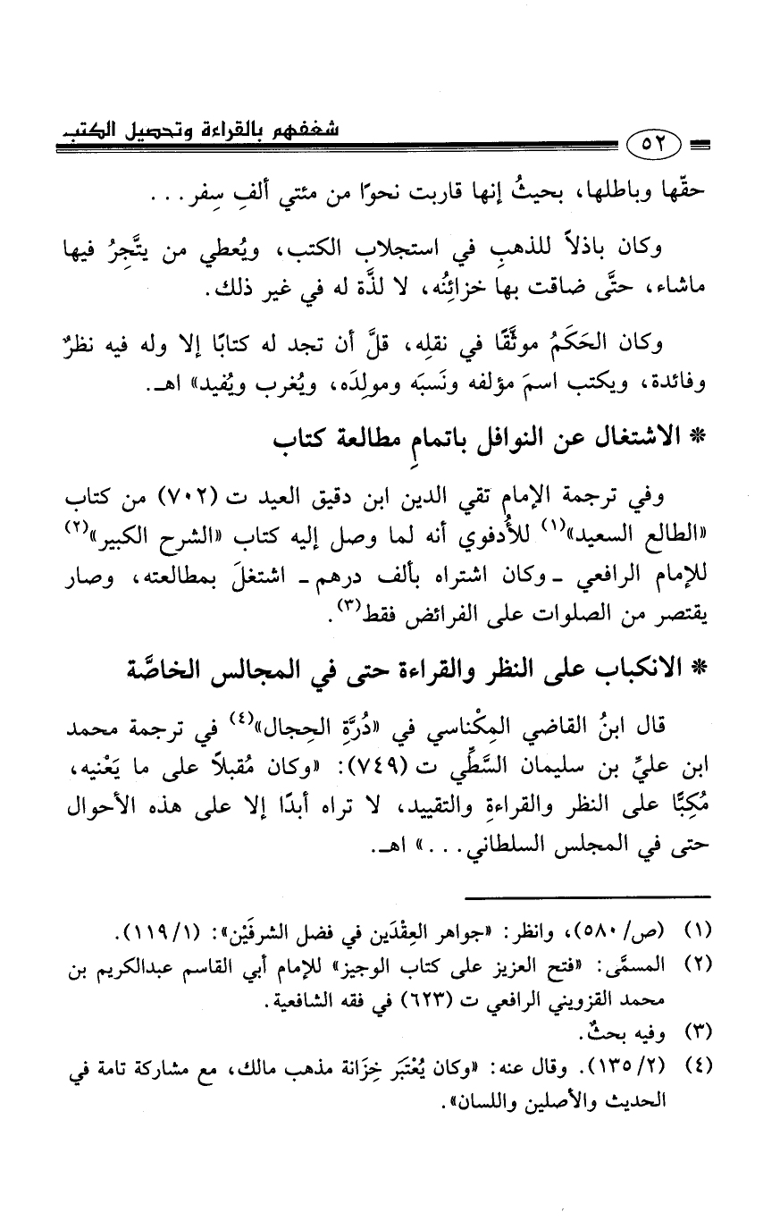 وفي ترجمة الإمام تقي الدين ابن دقيق العيد ت (702) من كتاب ((الطالع السعيد)) (1) للأُدفوي أنه لما وصل إليه كتاب ((الشرح الكبير)) (2) للإمام الرافعي -وكان اشتراه بألف درهم- اشتغلَ بمطالعته، وصار يقتصر من الصلوات على الفرائض فقط (3) .